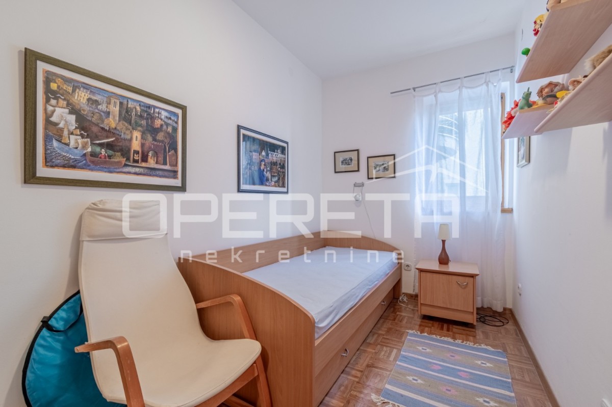 Die Wohnung hat eine Fläche von 52,85 m² und besteht aus zwei Schlafzimmern, einem Badezimmer, einem Wohnzimmer, einer Küche sowie einem Balkon mit Blick auf den zentralen Platz mit Brunnen und auf das Meer.