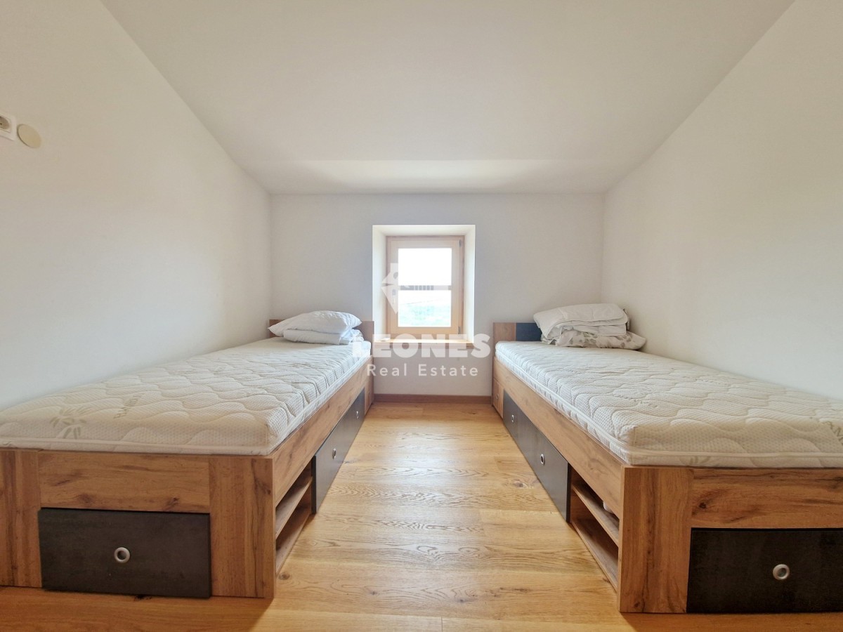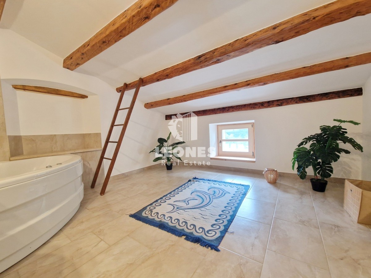 Nur bei der Agentur Leones. Zum Verkauf steht ein wunderschönes Reihensteinhaus mit Swimmingpool in der Nähe von Umag. Das Haus wurde im Jahr 2021 komplett renoviert und möbliert. Die Nettonutzfläche des Hauses beträgt 200 m2 und erstreckt sich über drei Etagen. Im Erdgeschoss gibt es ein Wohnzimmer, ein Esszimmer, eine Toilette, eine Küche und einen Flur, der zu einer großen Terrasse führt, d. h. einer Oase des Grüns und der Ruhe, wo es einen Kamin, einen Tisch im Freien und einen Abstellraum im Freien gibt Zimmer und ein 28 m2 großes Schwimmbad, wo Sie den Sommer genießen und abkühlen können. Der Hof hat eine Fläche von 278 m2. Im ersten Stock befinden sich 2 Schlafzimmer und ein Badezimmer, während sich im zweiten Stock 2 Schlafzimmer mit Meerblick, ein großes Badezimmer mit Hydromassage-Badewanne und eine Toilette befinden. Das Haus verfügt über 2 Parkplätze.