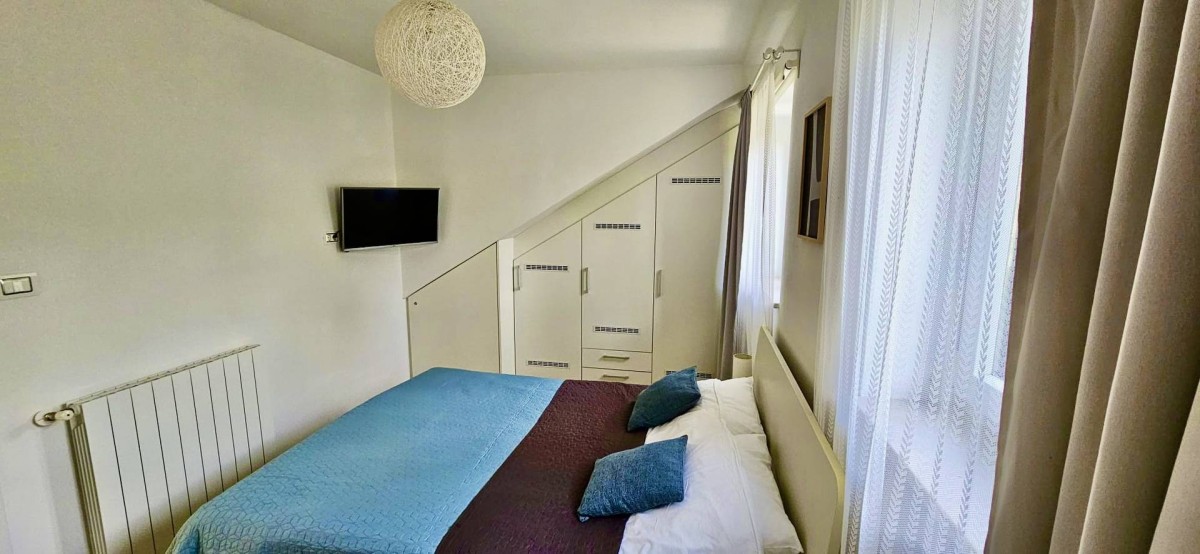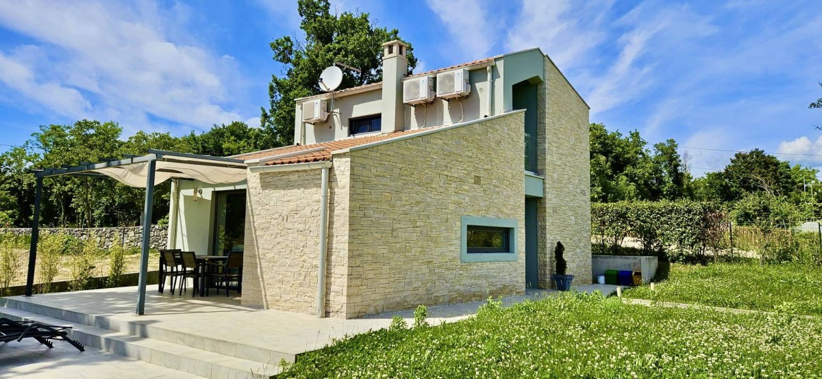 Das Haus erstreckt sich auf einem großzügigen Grundstück mit einer Gesamtfläche von 781 m2 und bietet einen schönen Blick auf die umliegende Natur. Im Erdgeschoss befinden sich ein luftiges Wohnzimmer mit Zugang zur Terrasse, eine voll ausgestattete Küche, ein Esszimmer, ein Abstellraum, ein Gästetoilette und ein Schlafzimmer mit eigenem Bad. Über eine Innentreppe gelangt man in das Obergeschoss, wo sich ein weiteres Schlafzimmer mit eigenem Bad, ein begehbarer Kleiderschrank sowie eine Loggia befinden. Besonders sind die Details aus natürlichen Materialien – Holz und Stein –, die dem Raum Wärme und ein heimeliges Ambiente verleihen. Die Beheizung und Kühlung der Räume erfolgt über Klimageräte, und dank der elektrischen Zentralheizung ist dieses Haus für das Wohnen über das ganze Jahr geeignet. Der Kamin mit Holzfeuer sorgt neben der Beheizung für eine zusätzliche gemütliche Atmosphäre und Wärme im Zuhause.