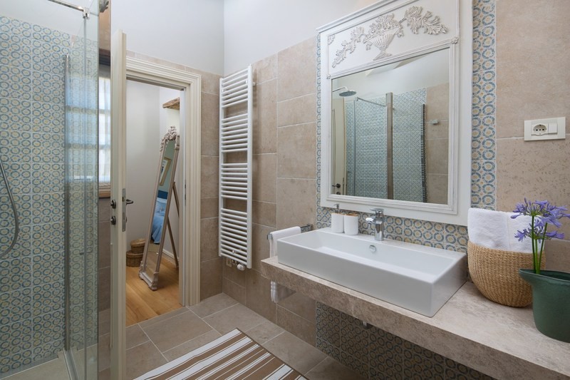 The ground floor is dedicated entirely to sumptuous living, with a wonderful long room divided by archways into living and dining/cooking areas with French doors bringing the abundance of warm Istrian light inside. Exposed stonework, beamed ceilings and a beautiful open fireplace create a warm and pleasant atmosphere, while a mix of modern and vintage furnishings and exquisite fittings provide you with high quality comforts.