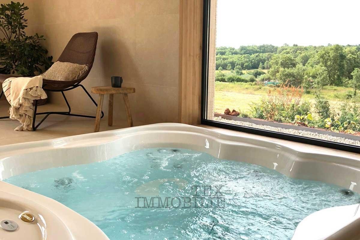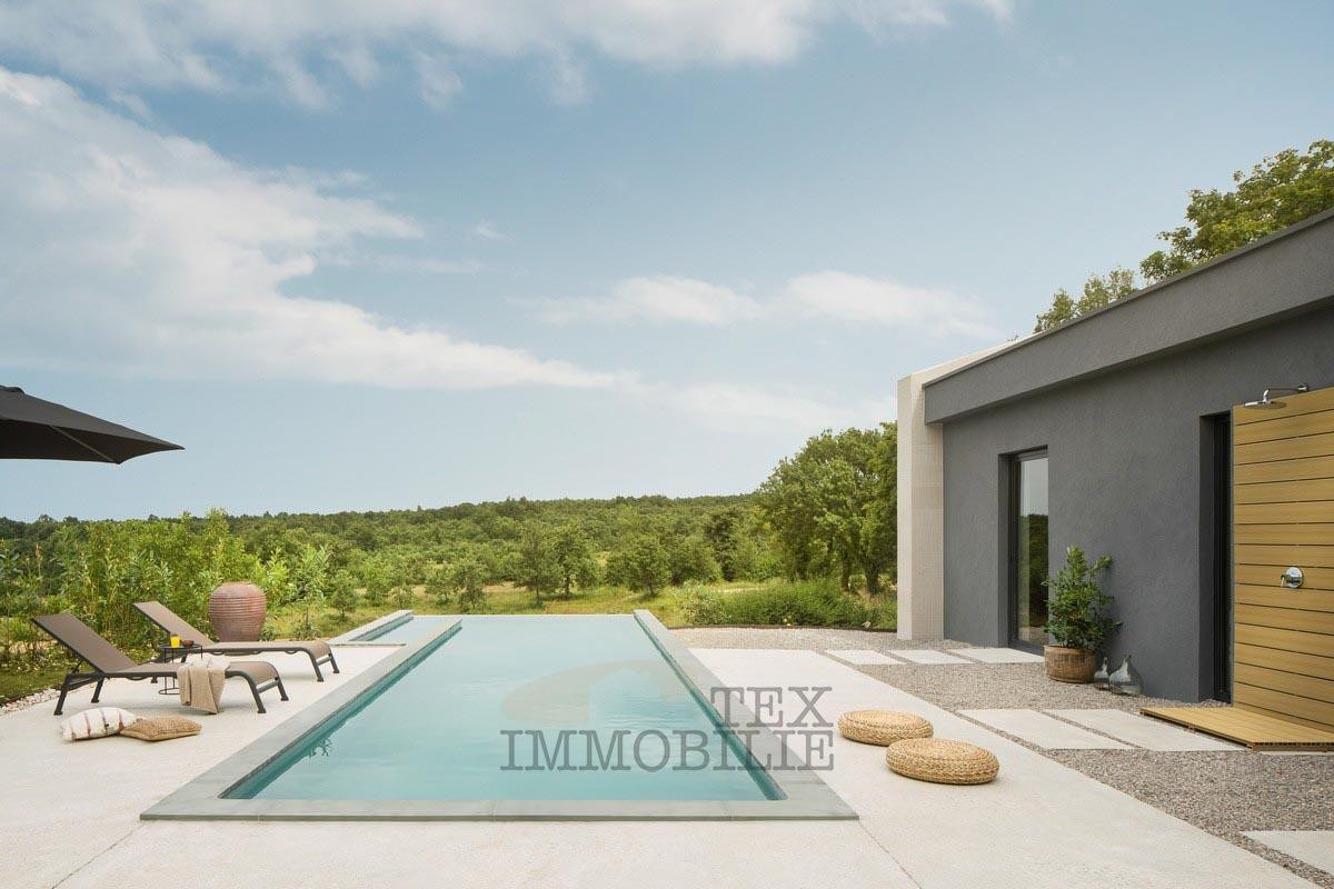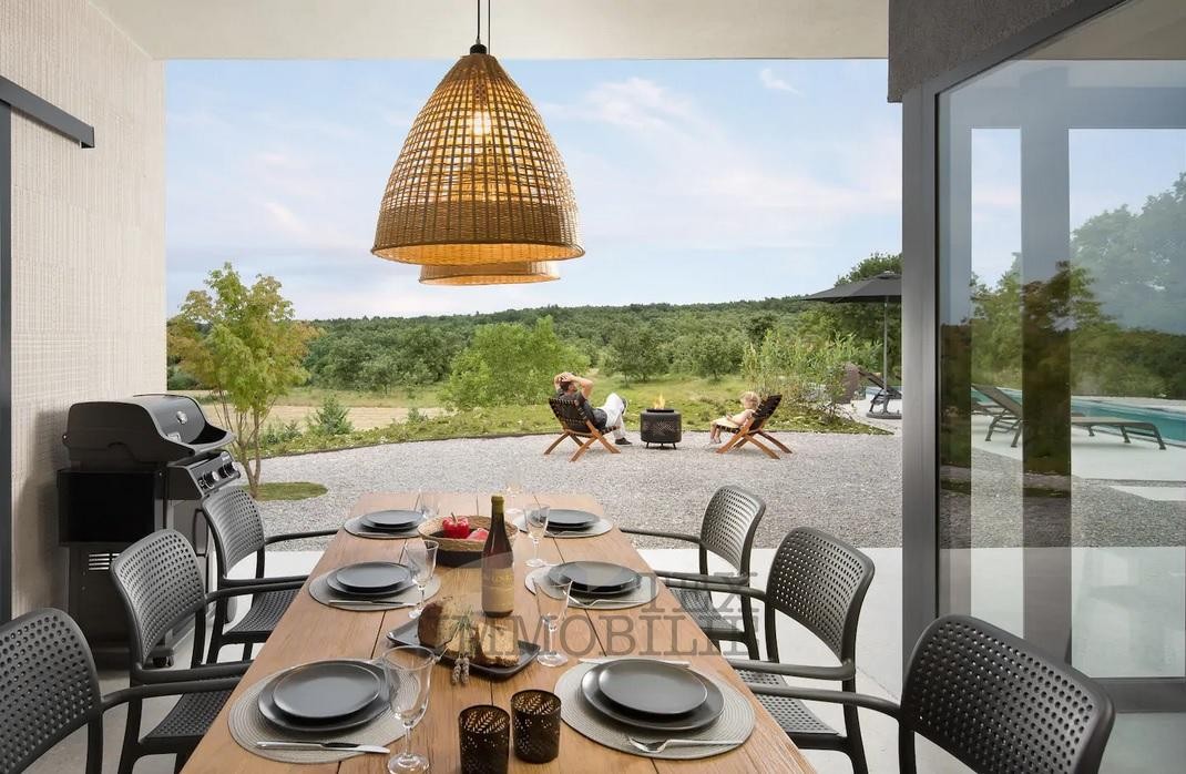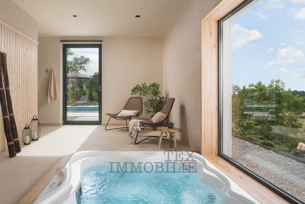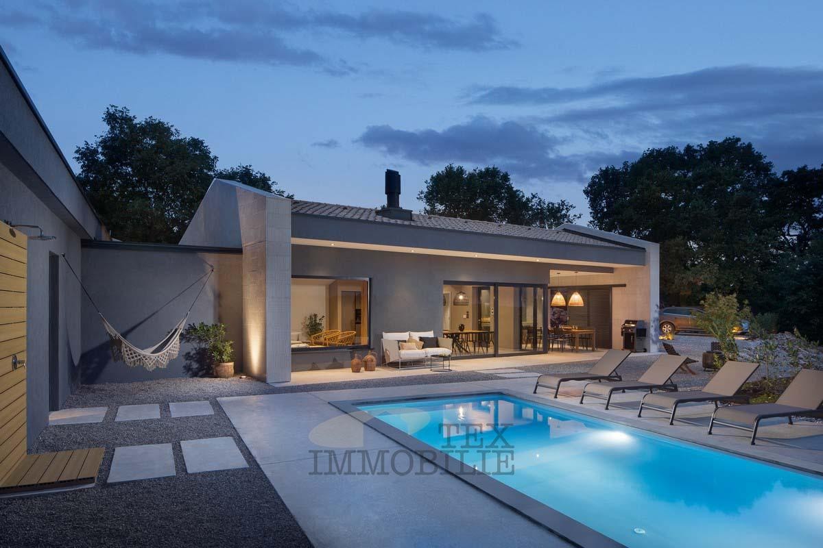 We are selling a beautiful villa that perfectly combines traditional elements with modern design. Located in a green and quiet environment near the Lim Bay, 23 km from the sea and the famous tourist destinations of Porec and Rovinj. The villa spreads over 289 m2 and consists of a large living room, dining room, and kitchen of superior design, 4 bedrooms with private bathrooms with showers, covered outdoor dining room with barbecue, summer kitchen, storage, toilet for guests, and wellness room which features a Finnish sauna and a whirlpool. Hidden fan-coil units are the most modern heating and cooling systems that provide complete comfort in all rooms of the villa. The surroundings of the house are adorned with a large pool of 40 m2 and a sun deck ideal for relaxing and enjoying.