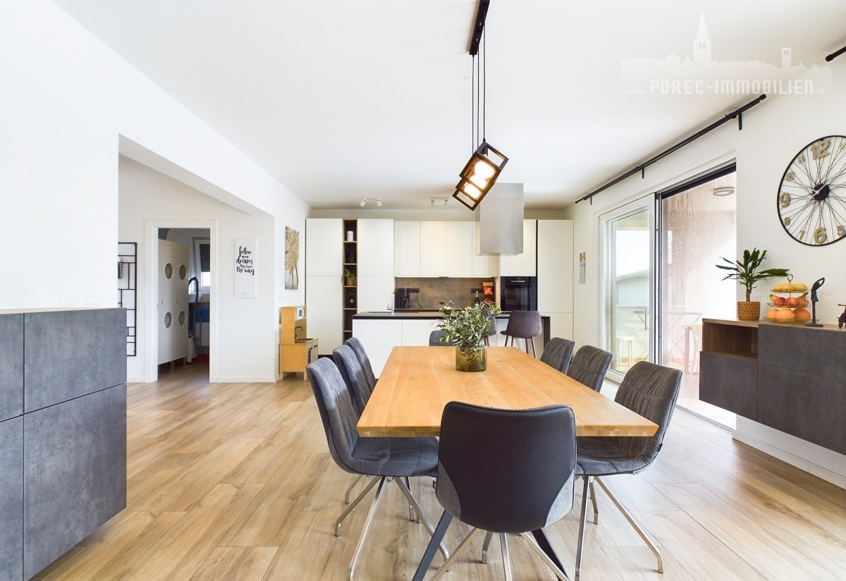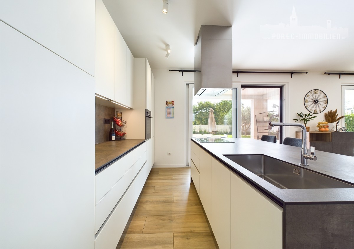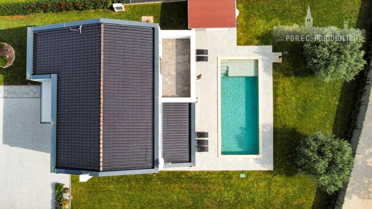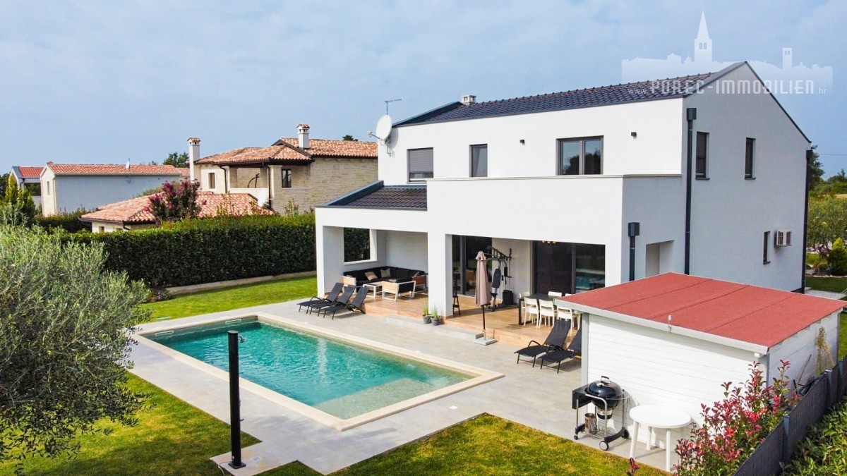 For sale is a beautiful, modernly designed villa with a pool, only 5 km from the center of Porec and 500 meters from the first shops.