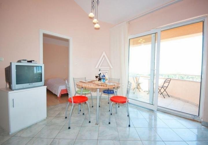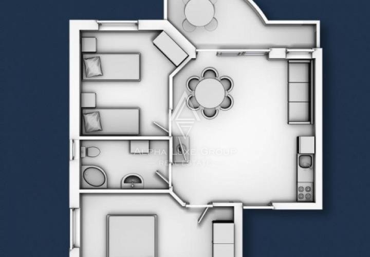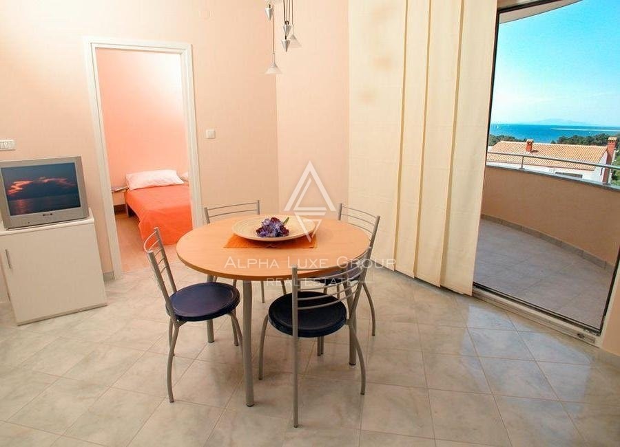 The home comprises thirteen two-room flats, a reception area, and a basement. Each apartment has a living room, a kitchen, a dining room, a bathroom, and two bedrooms with terraces with magnificent views of the sea.