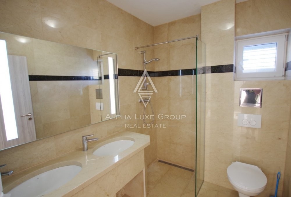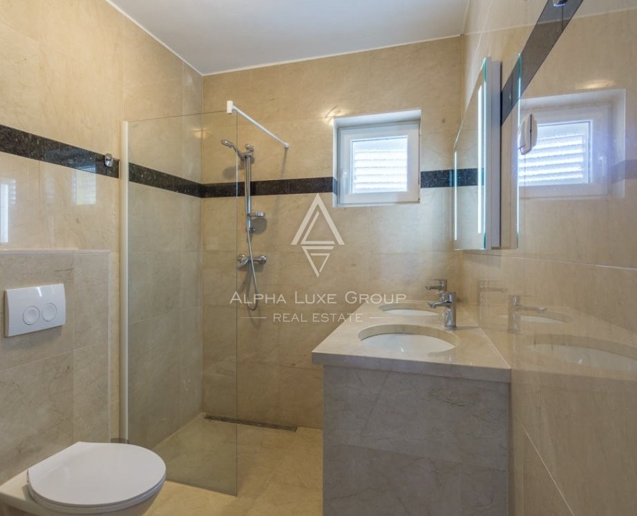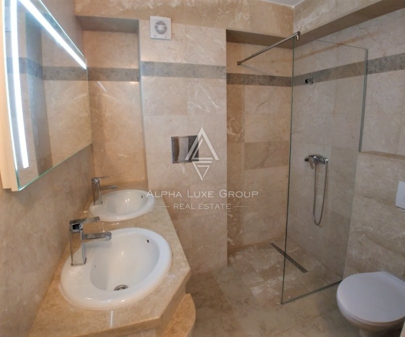 Massive marble, natural stone, and wooden parquet were used in the apartment and bedrooms throughout the house, completed in 2018.
