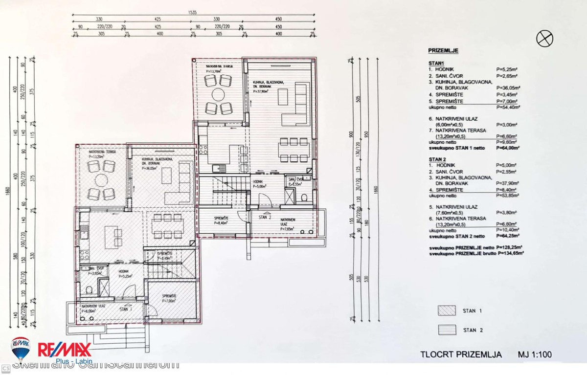 Both apartments have a similar layout and surfaces, which extend through the ground floor and first floor. The ground floor with its area of 64 m2 includes an entrance hall, bathroom, kitchen with dining room and living room, and two storage rooms, while the first floor is reached by an internal staircase and there we will find three bedrooms, two bathrooms, a laundry room and an entrance hall. Each half of the building, or each apartment, also has a part of the garden measuring 150 or 250 m2 (depending on which part of the house is bought), as well as two parking spaces.