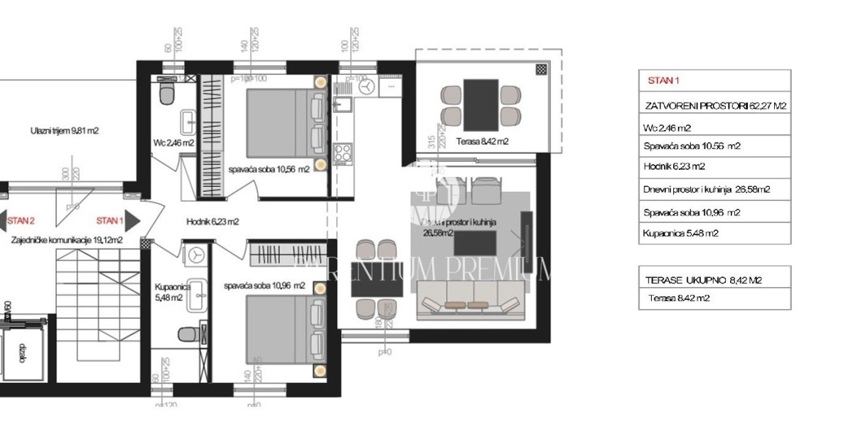 The total living area is 66.48 m², plus a storage room in the basement of 5.5 m². The apartment consists of an entrance hallway, bathroom, guest WC, two bedrooms, and a spacious living room with kitchen and dining area, with access to a terrace of 8.42 m².