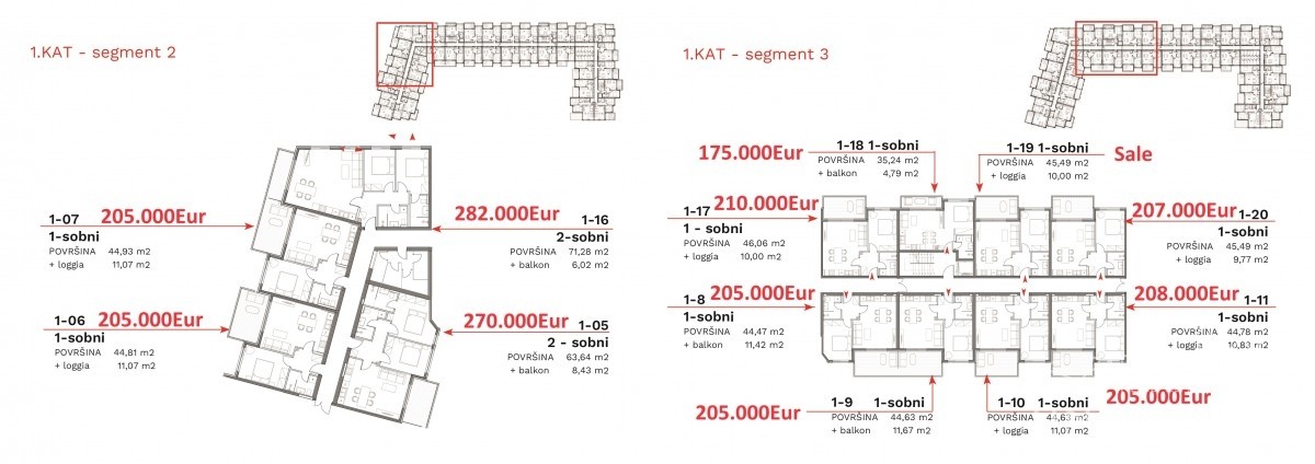 Below you can view pictures of the building along with floor plans that highlight the respective prices of individual apartments.