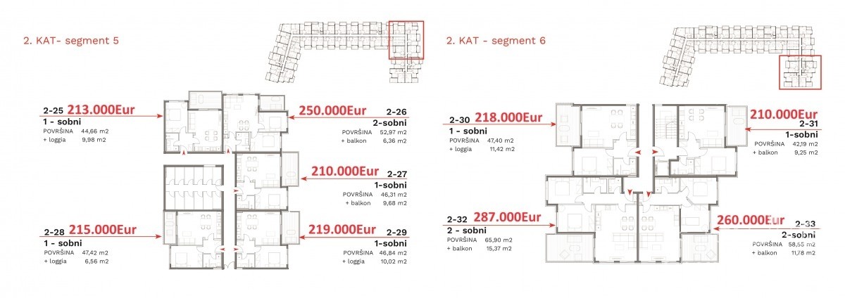 Below you can view pictures of the building along with floor plans that highlight the respective prices of individual apartments.