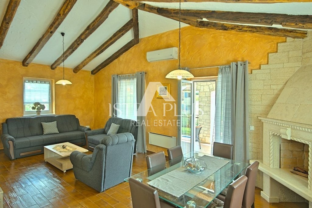 Detached house with pool located in a small Istrian town in a very quiet location. It was built in 2013 in the autochthonous, Istrian style, on a plot of 770 m2. It consists of ground and first floor. The ground floor has an entrance hall, hallway, pantry, bedroom, bathroom, kitchen, living room, storage room and a large covered terrace of 20 m2. An internal staircase leads to the first floor where there are two more bedrooms, a bathroom and a covered terrace of 9 m2. Each room has a TV and internet. The house has 162.53 m2 of usable space with terraces (according to the coefficient slightly less - 145 m2). The house is fully equipped with furniture and equipment, and is rented for tourist purposes. In the garden there is a swimming pool of 33 m2 and a summer kitchen, covered parking for two cars and a landscaped garden. Given the large number of reservations, the house has great potential for tourist rental, but it can also serve the purpose of housing.