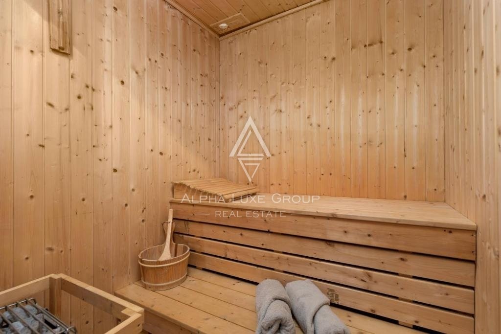 The ground floor includes a fully equipped kitchen, dining room, and comfortable living room. There is also a gym with a sauna, shower, bathroom, bedroom, and laundry room. Upstairs there are two comfortable bedrooms and a bathroom with a hydromassage tub.