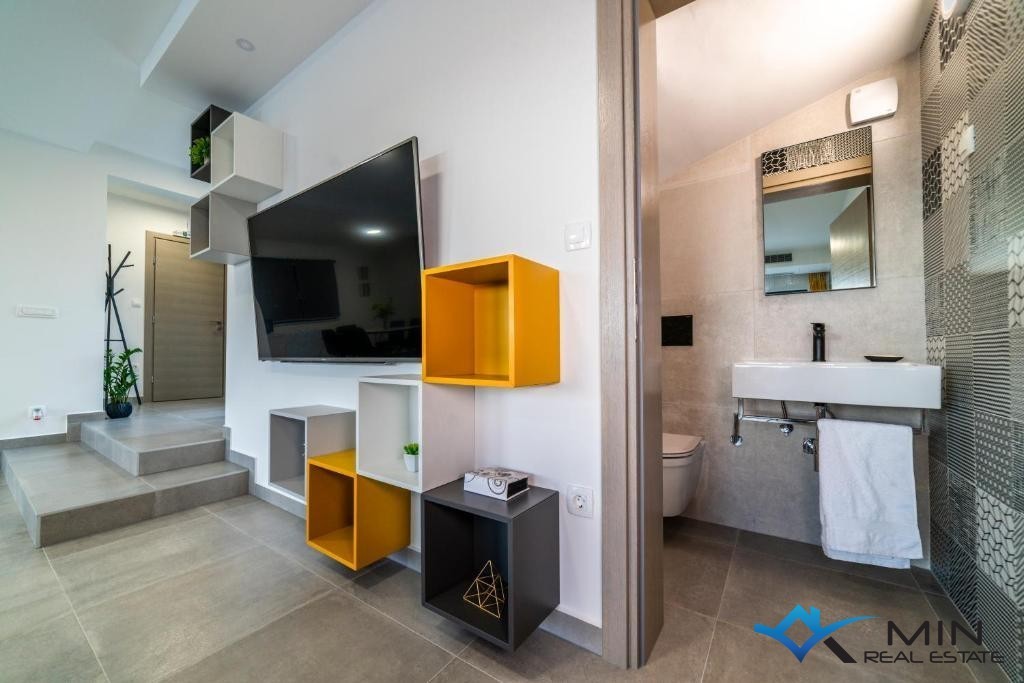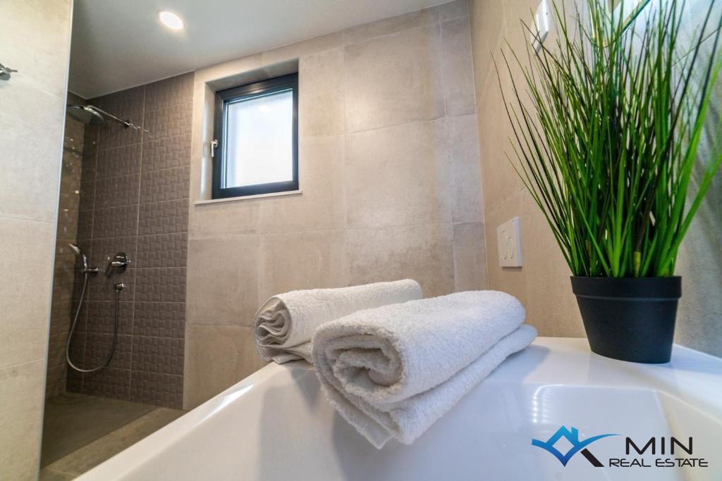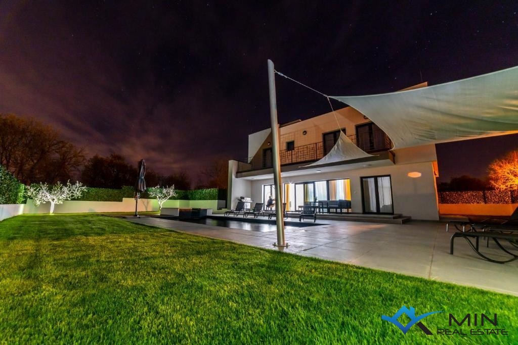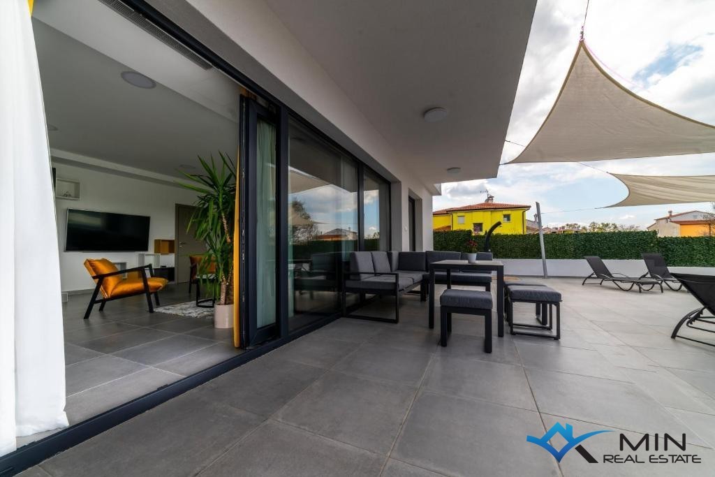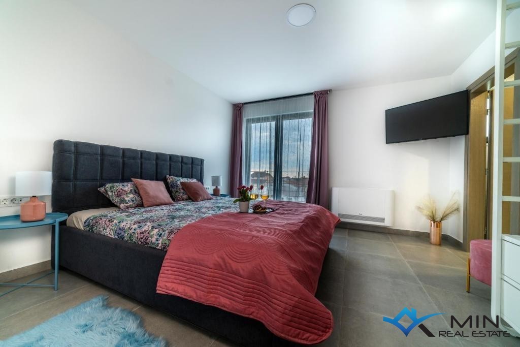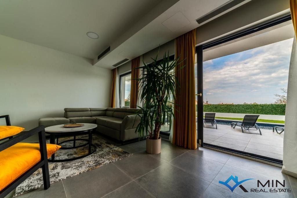 An attractive detached villa for sale in the vicinity of Poreč in a quiet location. The villa has 210 m2 and is divided into 2 floors. On the ground floor there is an entrance hall, a storage room, a storage room, a bedroom with a bathroom, a kitchen with a dining room and a spacious living room with an exit to the garden. On the 1st floor there are 3 bedrooms, 3 bathrooms, a terrace and a laundry room. Each bedroom has its own private bathroom and it is possible to access the terrace from each room. The villa has a beautifully landscaped garden of 592 m2 with a jacuzzi and a 37 m2 swimming pool. The garden has a lawn irrigation system. The villa has underfloor heating, and every room is equipped with air conditioning. The villa is rented for tourist purposes and has very good occupancy in pre-season, season and post-season. The distance from the nearest organized beach and the sea is 4 km, and the center of Poreč is 3 km away.