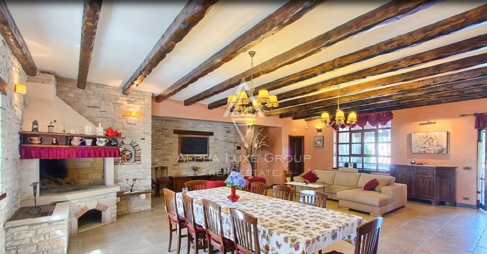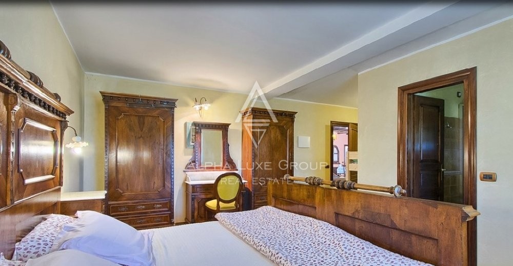 A hydromassage bath and exercise equipment are available on the ground floor in another relaxation area. There is a hallway, four bedrooms, two of which have their bathroom, two bedrooms with a shared bathroom, and a large terrace with a magnificent view of the landscape and the garden on the first level.