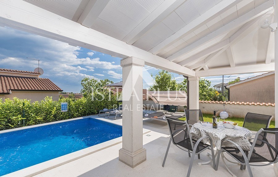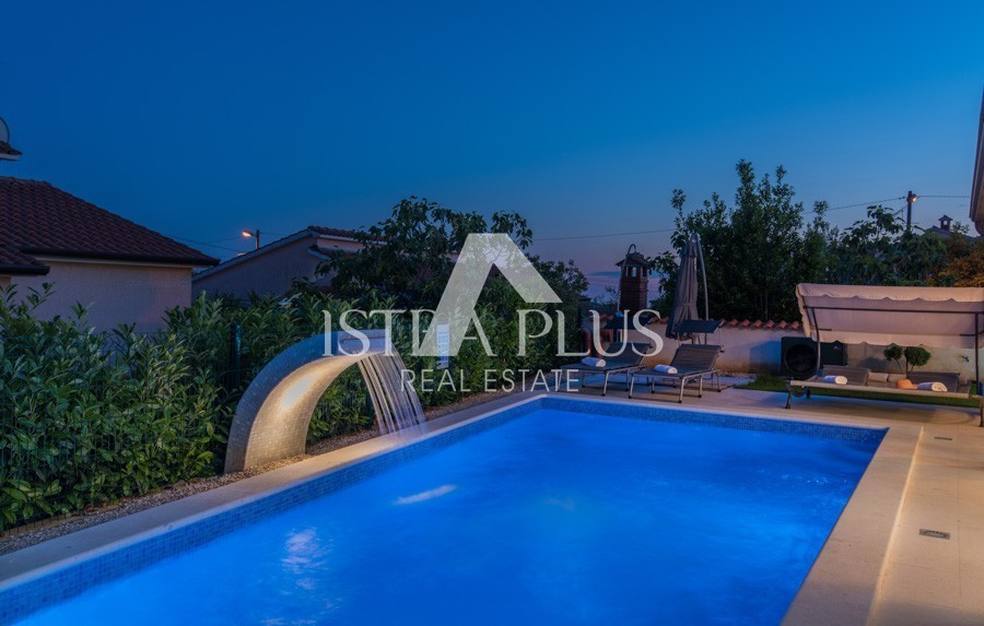 Detached one-story house with a living area of 136 m², consists of three bedrooms, three bathrooms and a storage room, a dining room with a kitchen, a living room with access to a covered terrace where there is a charming summer kitchen for relaxation. In the yard there is also a sunbathing area and a 29m2 heated pool with salt water, which has several hydromassage jets and a waterfall.