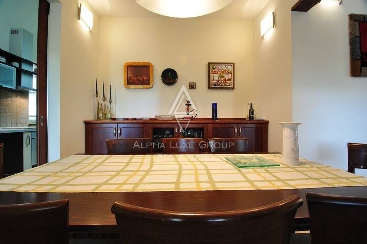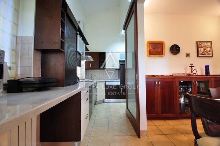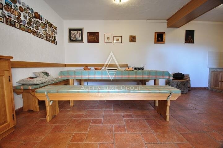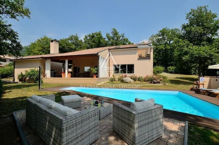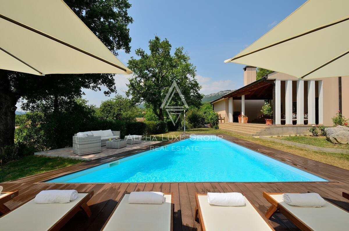 Outdoors, the expansive grounds, including a 50m² swimming pool with a sun deck, are meticulously landscaped, offering peace and privacy. This property is ideal for tranquil family living or as a lucrative tourist investment, given its location in Buzeština, a region of diverse excursion opportunities and breathtaking hillside views.