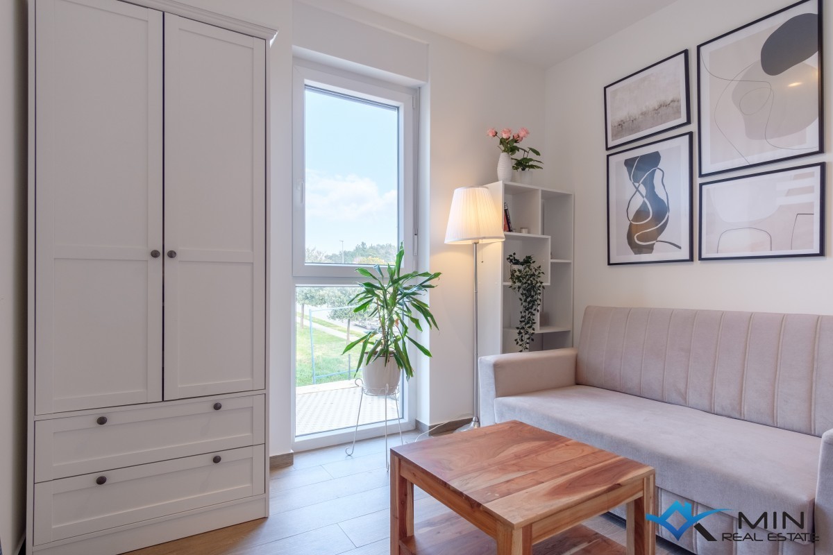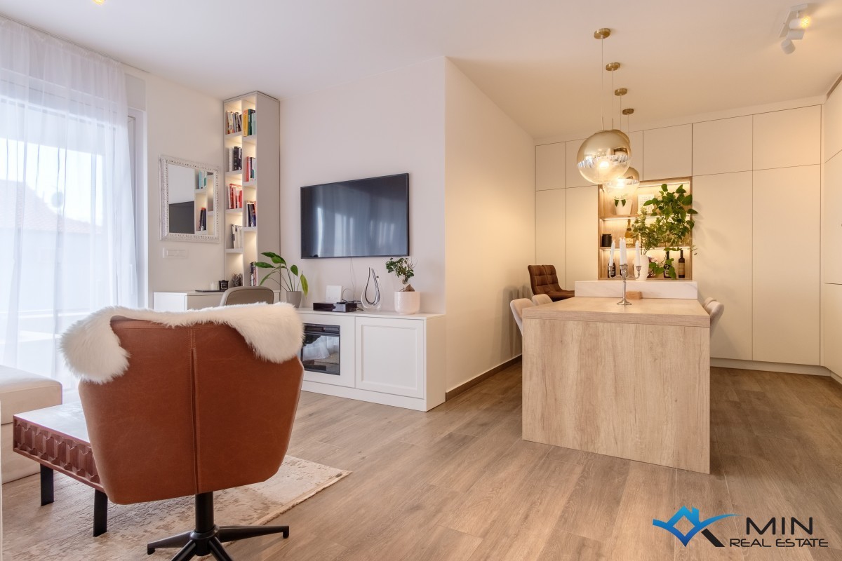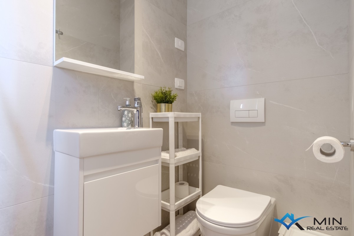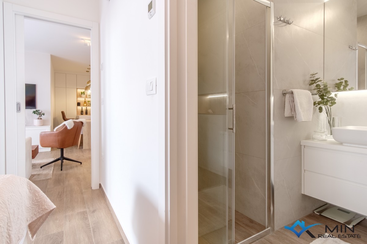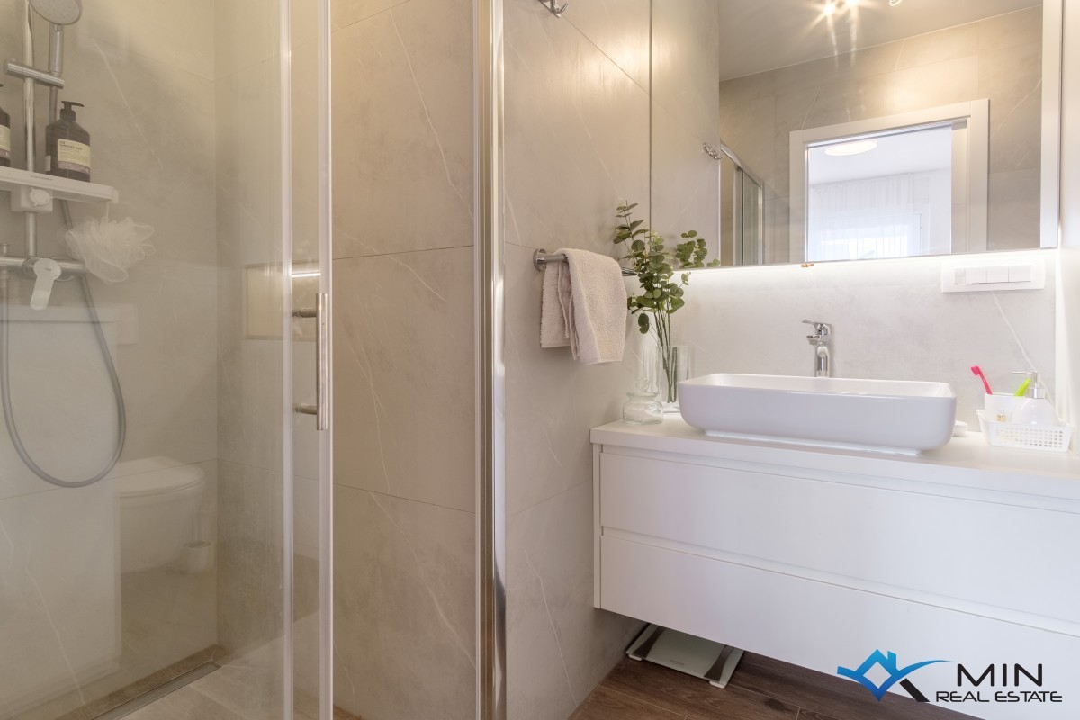 A superbly appointed flat is for sale on the first floor of a residential building comprising a total of eight flats. The flat exudes warmth and modern design, and it is sold fully furnished with custom-made furniture, which makes the space both highly functional and elegant, with attention paid to every detail during the decoration. The flat consists of a hallway, a bedroom with a private bathroom (currently converted into a modern home office), a second bedroom with an en-suite bathroom and access to the terrace, and an open-plan area featuring a kitchen, dining room, and lounge, which connects to a spacious covered terrace of 20 m² offering a stunning sea view. The flat is equipped with electric underfloor heating throughout (each room has its own thermostat), air conditioning units in every room (three in total), and an electric fireplace that further enhances the atmosphere and comfort of the flat. It also boasts a built-in air recuperator, which improves quality of life by enabling natural air circulation and efficient heat or cooling transfer between the interior and exterior, with minimal energy consumption. A major advantage of this flat is the two parking spaces, each measuring 12.5 m².