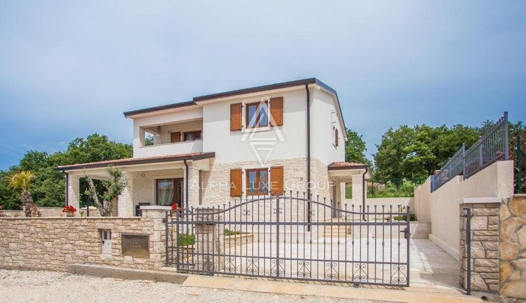 A villa with a pool and sea view is for sale in a beautiful location in Istria, 8 kilometers from the sea. It's on the outskirts of a freshly constructed roadway with equally lovely residences. The home boasts a magnificent ocean view.
