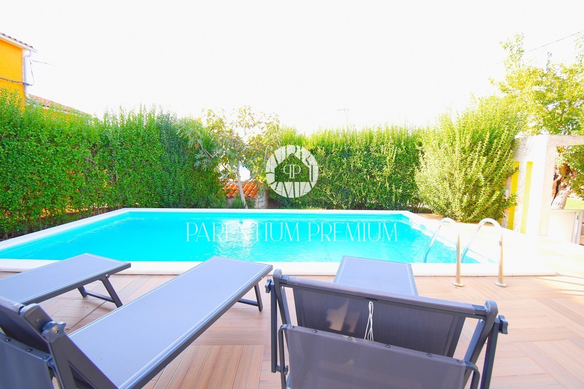 In the front part there is a yard surrounded by greenery that offers privacy where there is a swimming pool with a sunbathing area, and in the back part of the yard there is a summer kitchen with a dining table and a grill for enjoying the summer months.