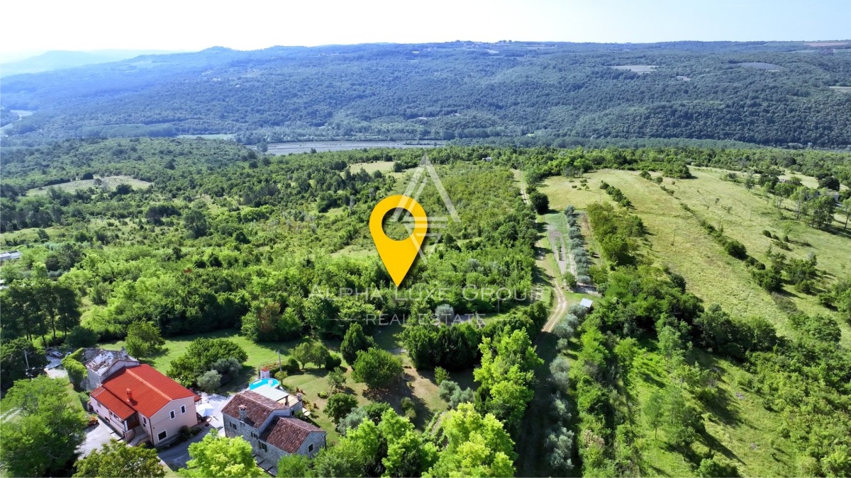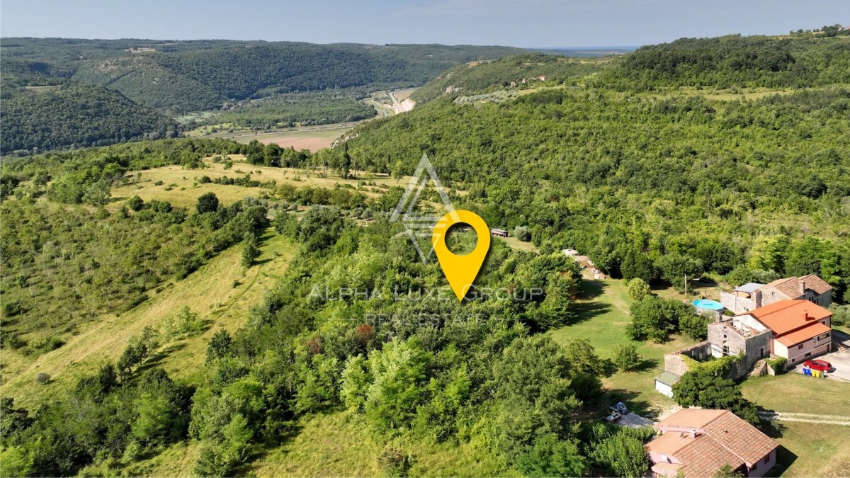 This exceptional plot near Grožnjan offers breathtaking panoramic views over the Mirna River Valley. Spanning approximately 5,400 m², the land is divided into a 1,200 m² building zone at an elevated position, perfect for constructing a luxury villa, while the remaining 4,100 m² consists of gently sloping agricultural land, ideal for olive groves or other Mediterranean cultivation.