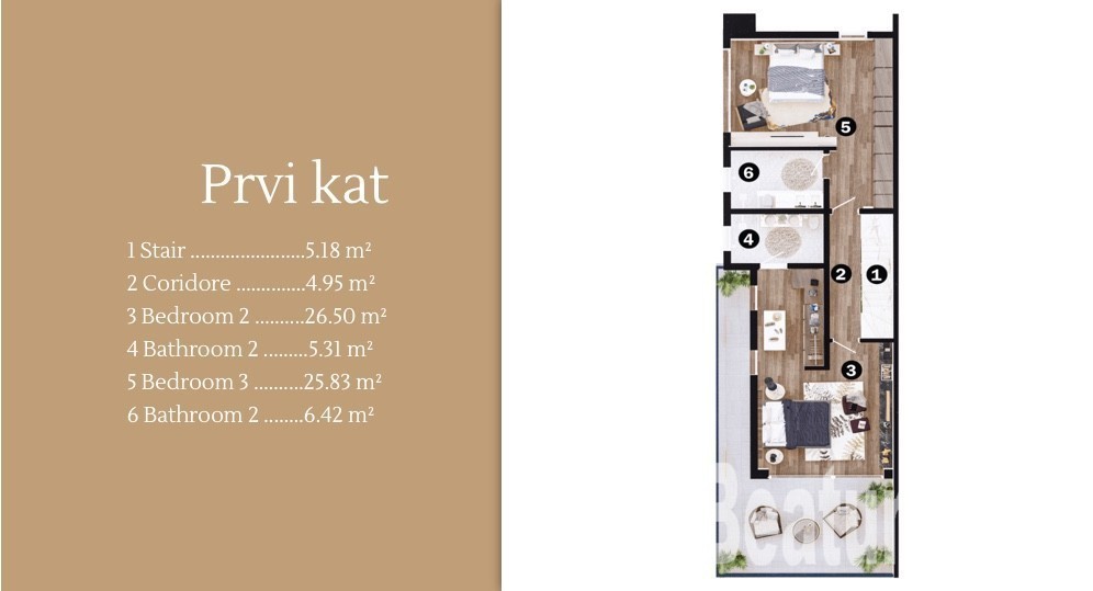 Upstairs: three bedrooms, each with its own bathroom, balcony