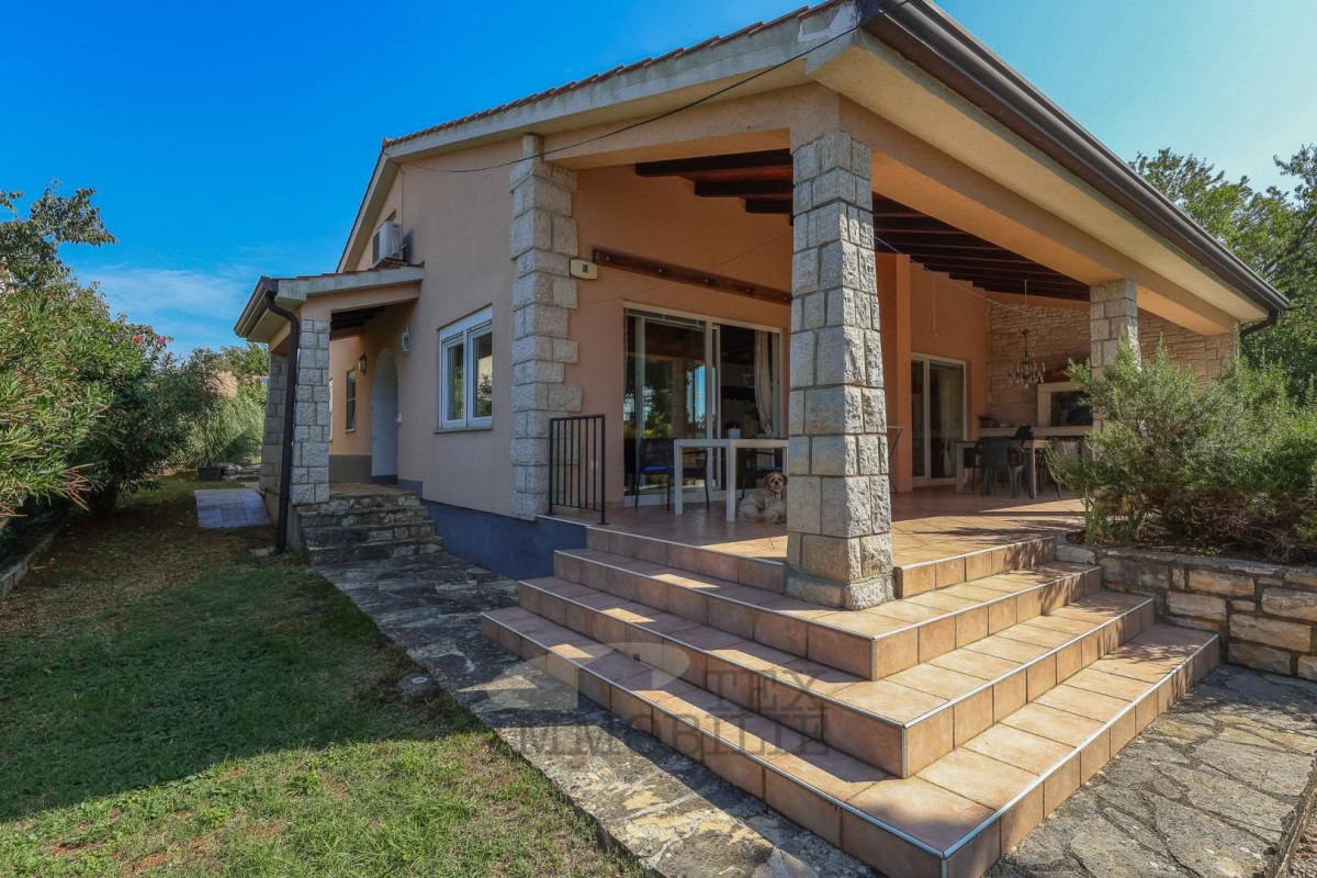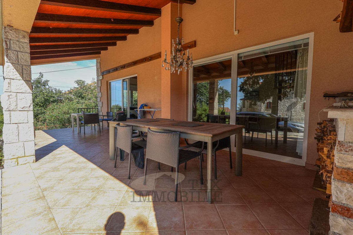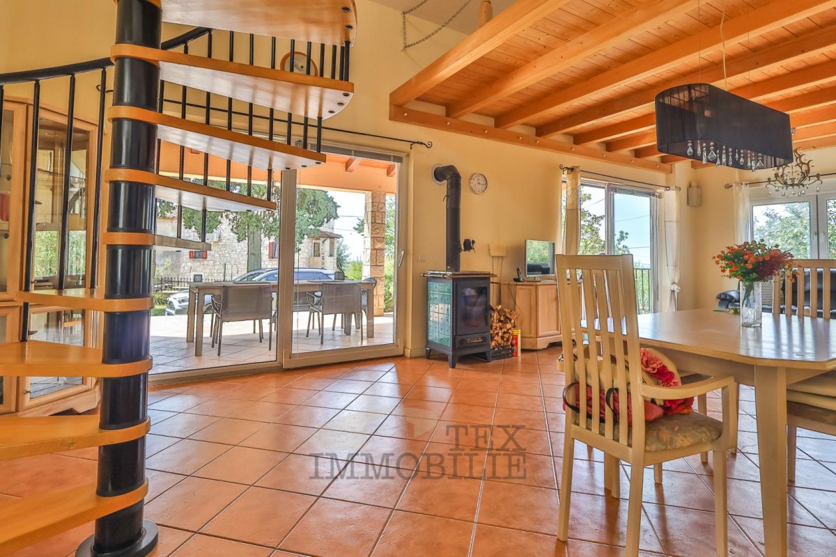 The two-story house is located in the vicinity of Poreč, 14 km away from the city center and 14 km from the sea. The ground floor consists of a living room/dining room, 3 bedrooms, a kitchen, and a bathroom. The first floor comprises a gallery, 2 bedrooms, and a bathroom. The terrace is covered and has an outdoor barbecue/grill. In front of the house, there is a large yard and private parking. The house is heated with wood and cooled with air conditioners.