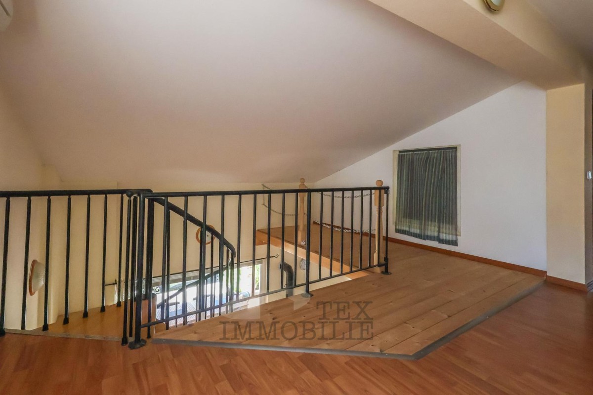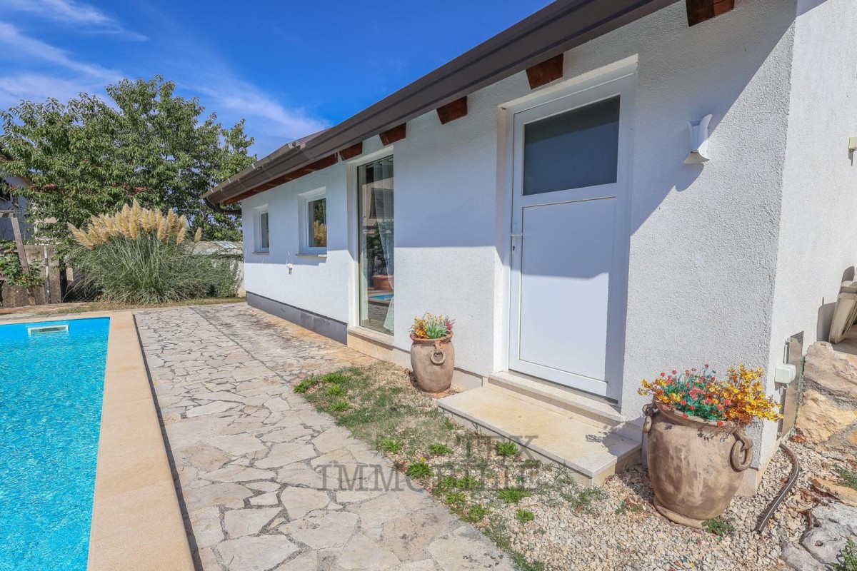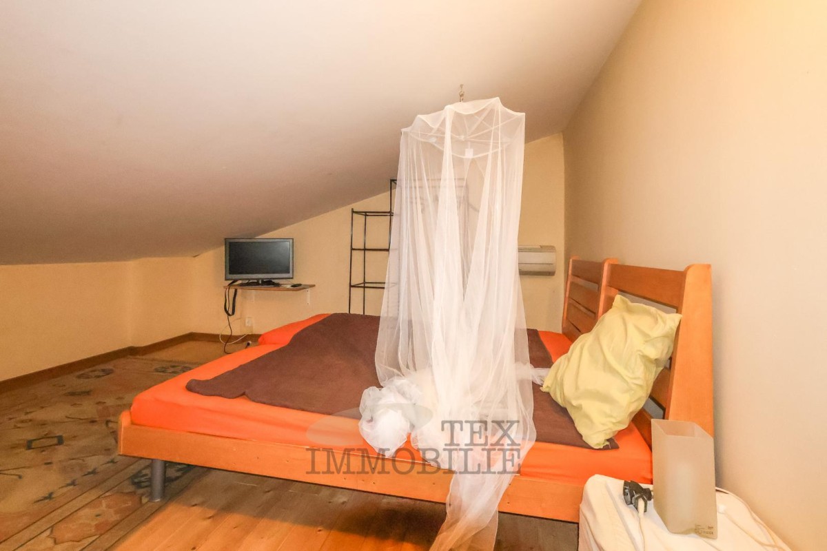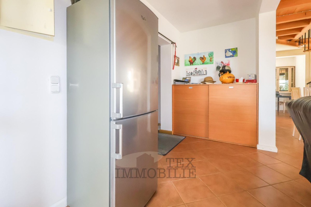 The two-story house is located in the vicinity of Poreč, 14 km away from the city center and 14 km from the sea. The ground floor consists of a living room/dining room, 3 bedrooms, a kitchen, and a bathroom. The first floor comprises a gallery, 2 bedrooms, and a bathroom. The terrace is covered and has an outdoor barbecue/grill. In front of the house, there is a large yard and private parking. The house is heated with wood and cooled with air conditioners.