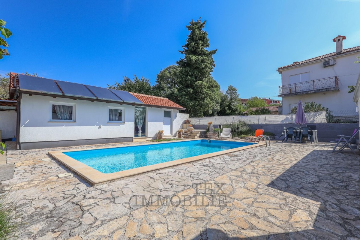An additional building next to the pool consists of two rooms equipped with air conditioners (TV + living room). The pool is 8m long and 3.8m wide. To maintain water cleanliness, a water cleaning machine is used, which includes two filters - a chlorine and sand filter, as well as a sand filter. These filters and the pump were replaced in 2022, ensuring flawless operation of the cleaning system. (The pool is heated). Four solar cells supply energy for hot water in the house, pool, outdoor shower, and outdoor toilet (500L boiler).