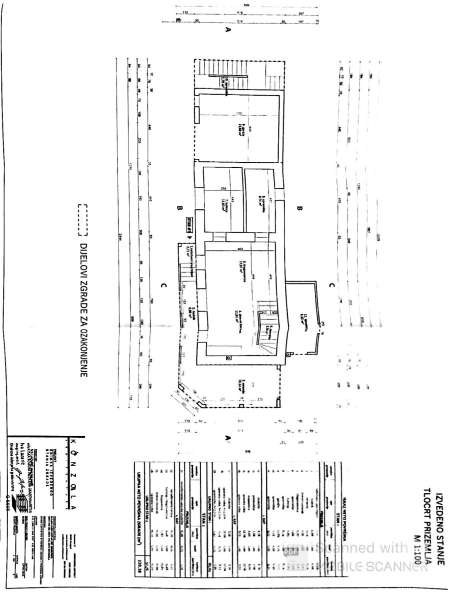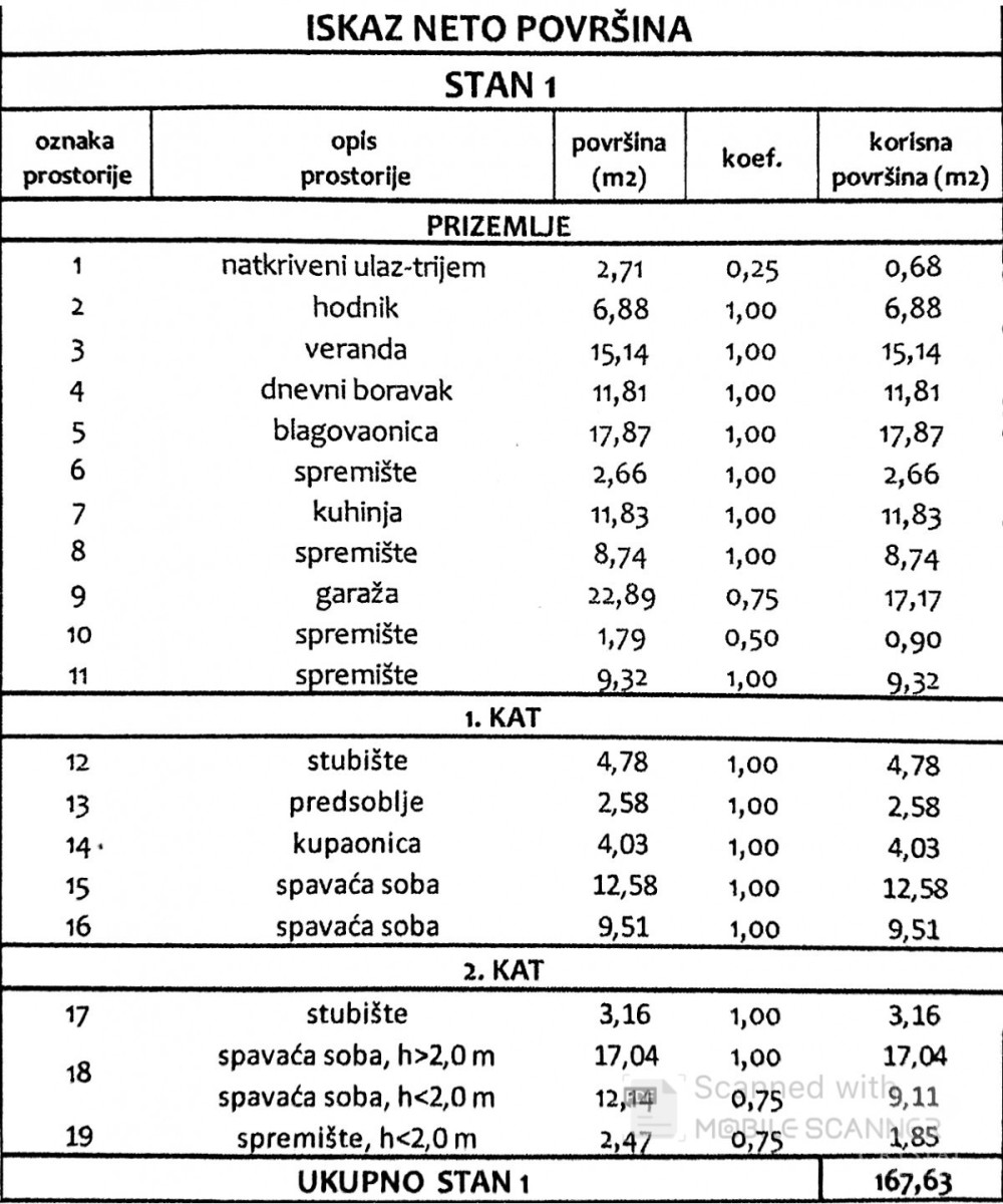 The first residential unit, a house, consists of a living and dining room (29.6 m2), kitchen (11.83 m2), two storage rooms (0.9 m2 and 9.32 m2), a veranda (15.14 m2) and a garage ( 17.17 m2).