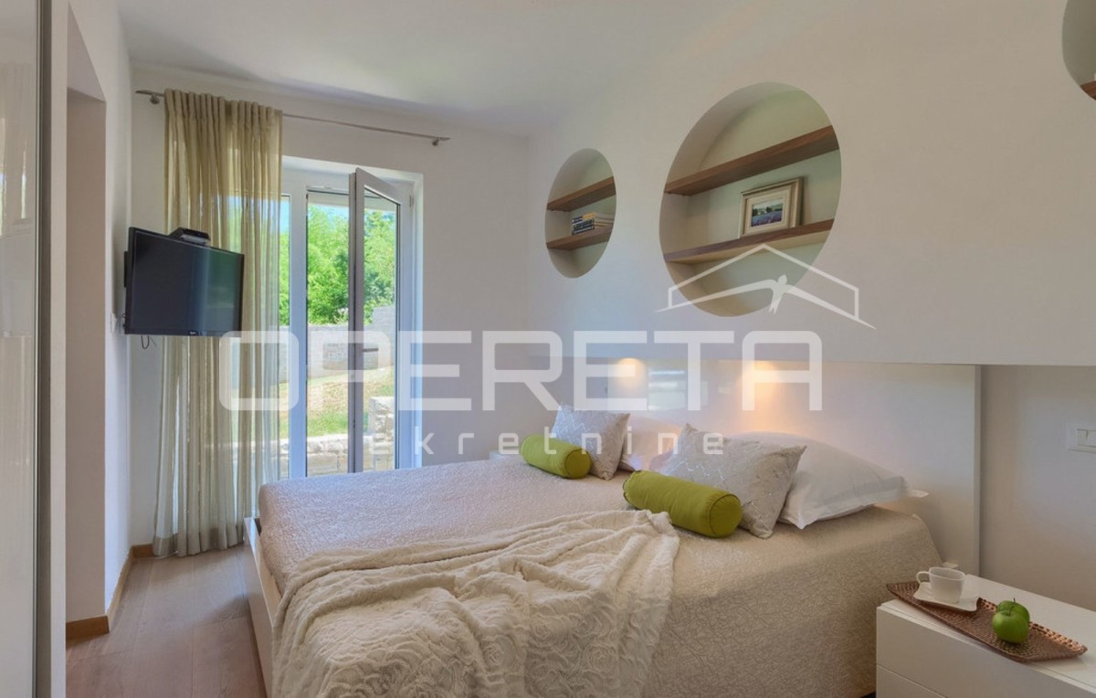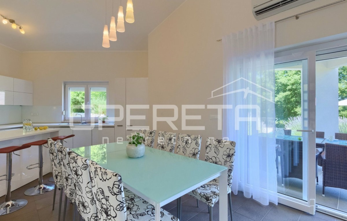 In an idyllic, quiet village near Labin, surrounded by untouched nature and greenery, this beautiful single-storey house with a net area of 171 m² is located, built on a spacious plot of 4,261 m². The house is located on the last edge of the construction area, which ensures complete privacy and a view of nature without neighboring buildings in the immediate vicinity.
