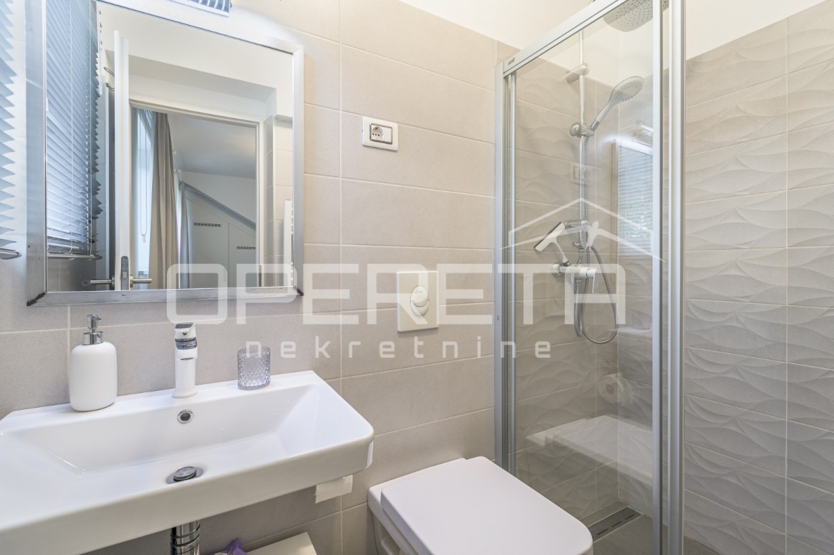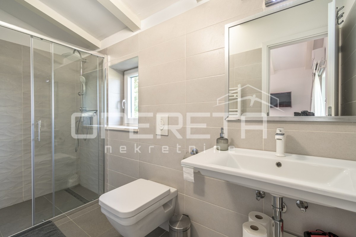 The house is designed for relaxation: the ground floor features a spacious living room with access to a covered terrace, a fully equipped kitchen, a dining room, and a bedroom with an en-suite bathroom. On the first floor, there's another bedroom with its own bathroom and a loggia. Natural materials like stone and wood give the space warmth and comfort. For heating and cooling, air conditioning units and electric central heating are used, and a fireplace provides a special ambiance.