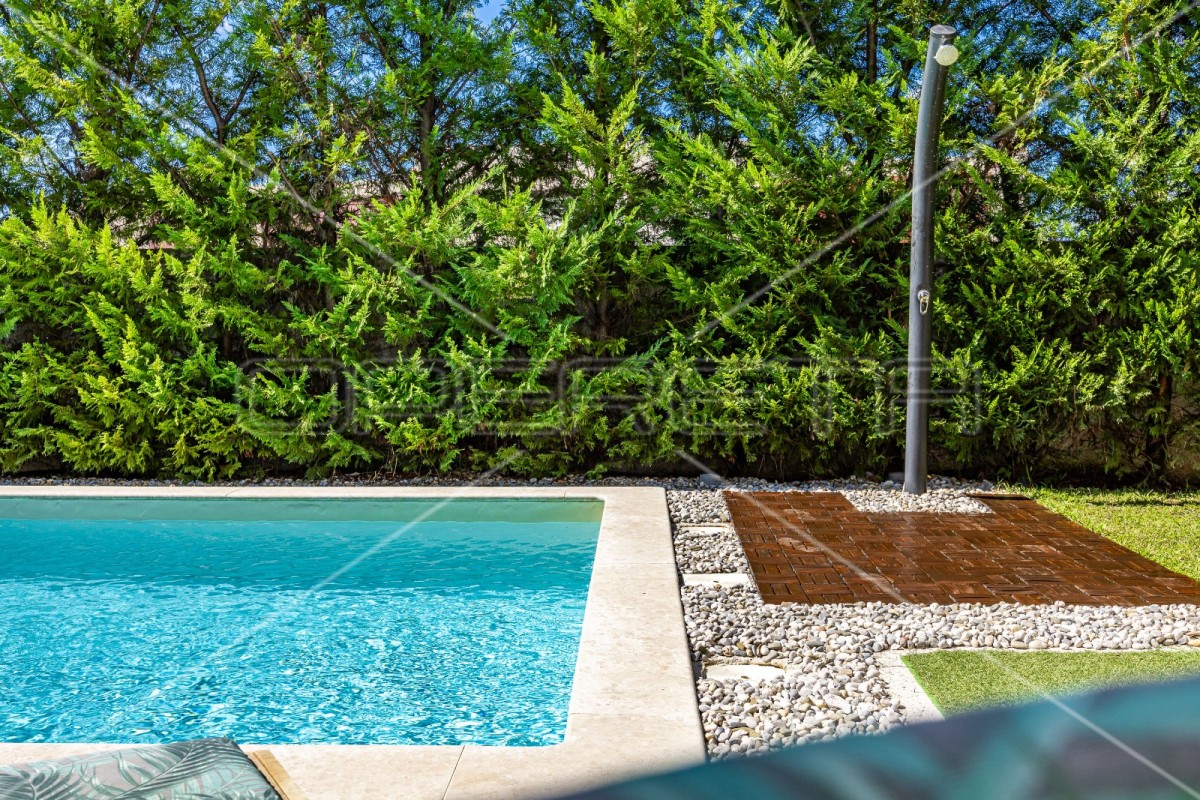 In the fenced and landscaped garden of 145 m2, there is a swimming pool, sunbathing area, outdoor shower and barbecue.
