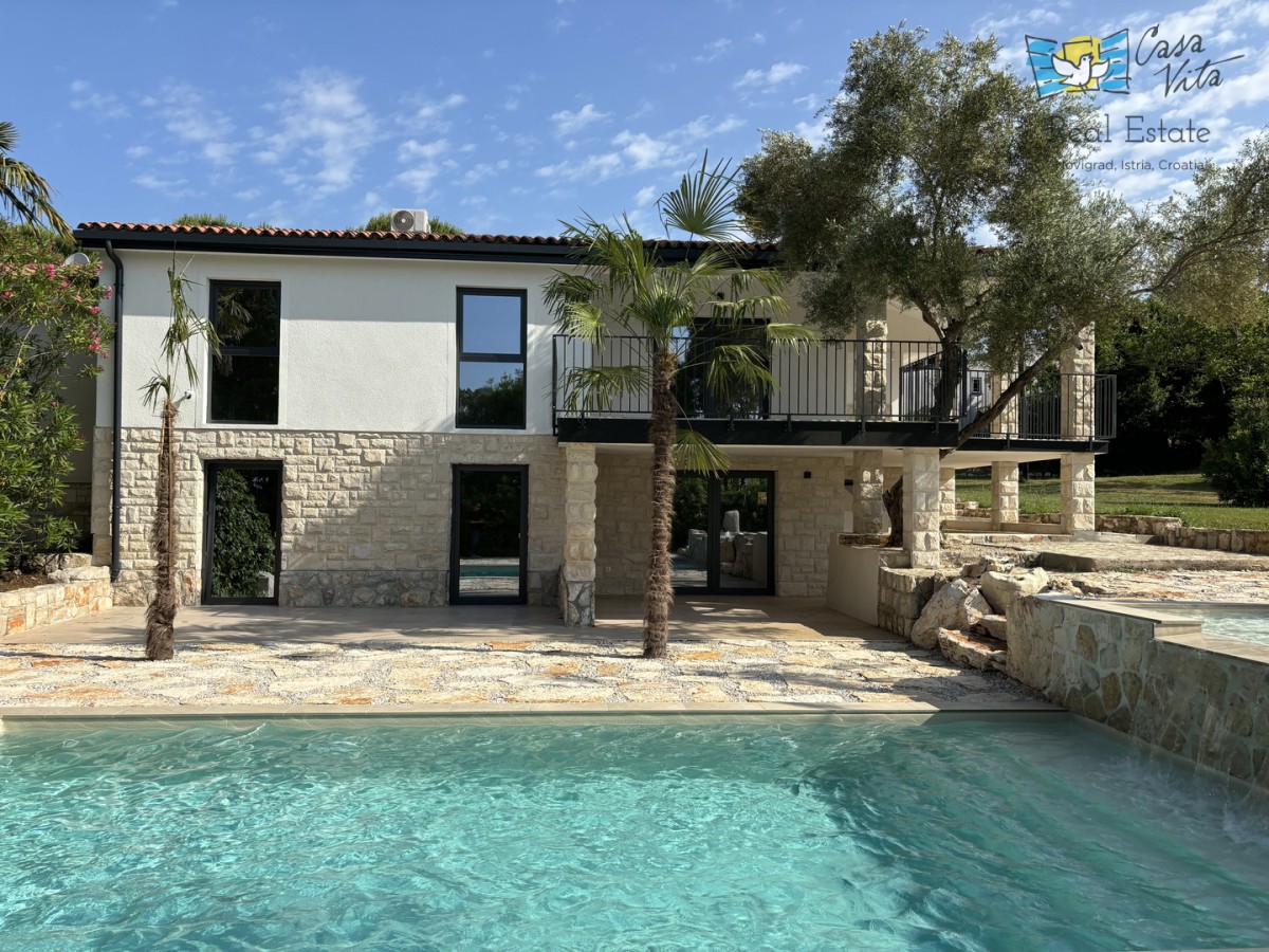 In front of the house, there is a pool measuring 10 x 4 m with a waterfall, surrounded by a sunbathing area, palm trees, and centuries-old olive trees that create a true Mediterranean atmosphere. The house features three built-in fireplaces – one in the living room and two on the terraces – perfect for relaxing evenings and outdoor gatherings.