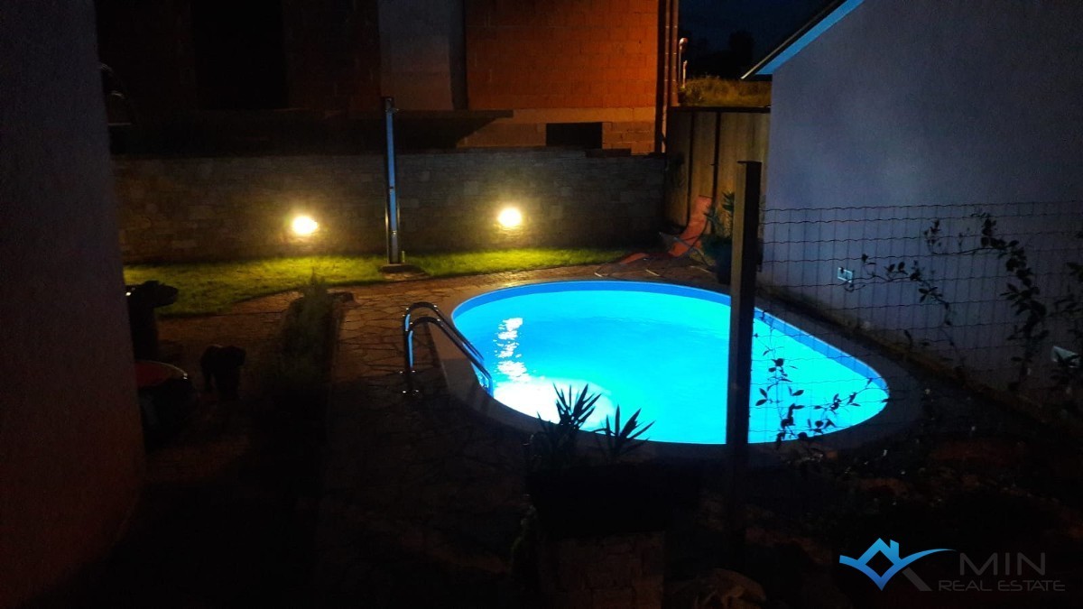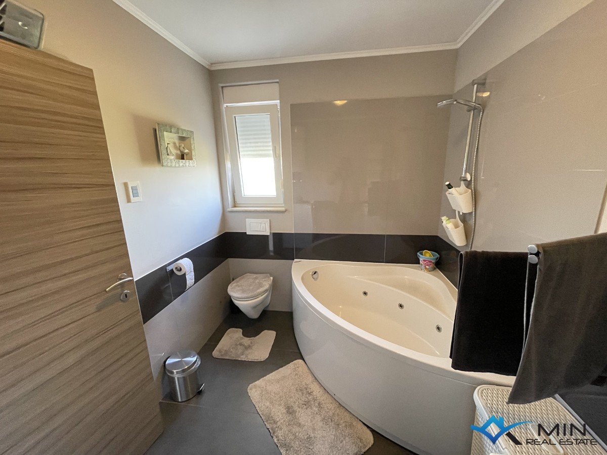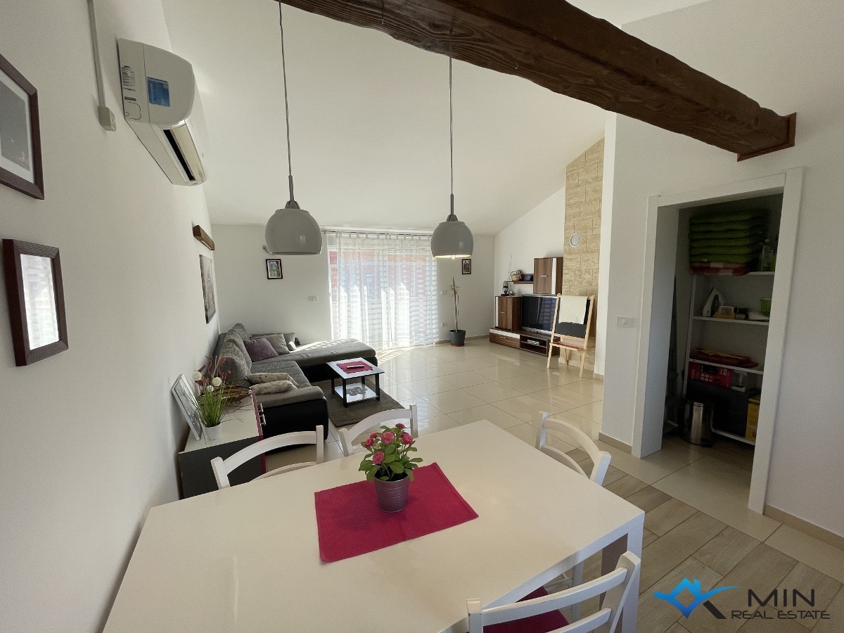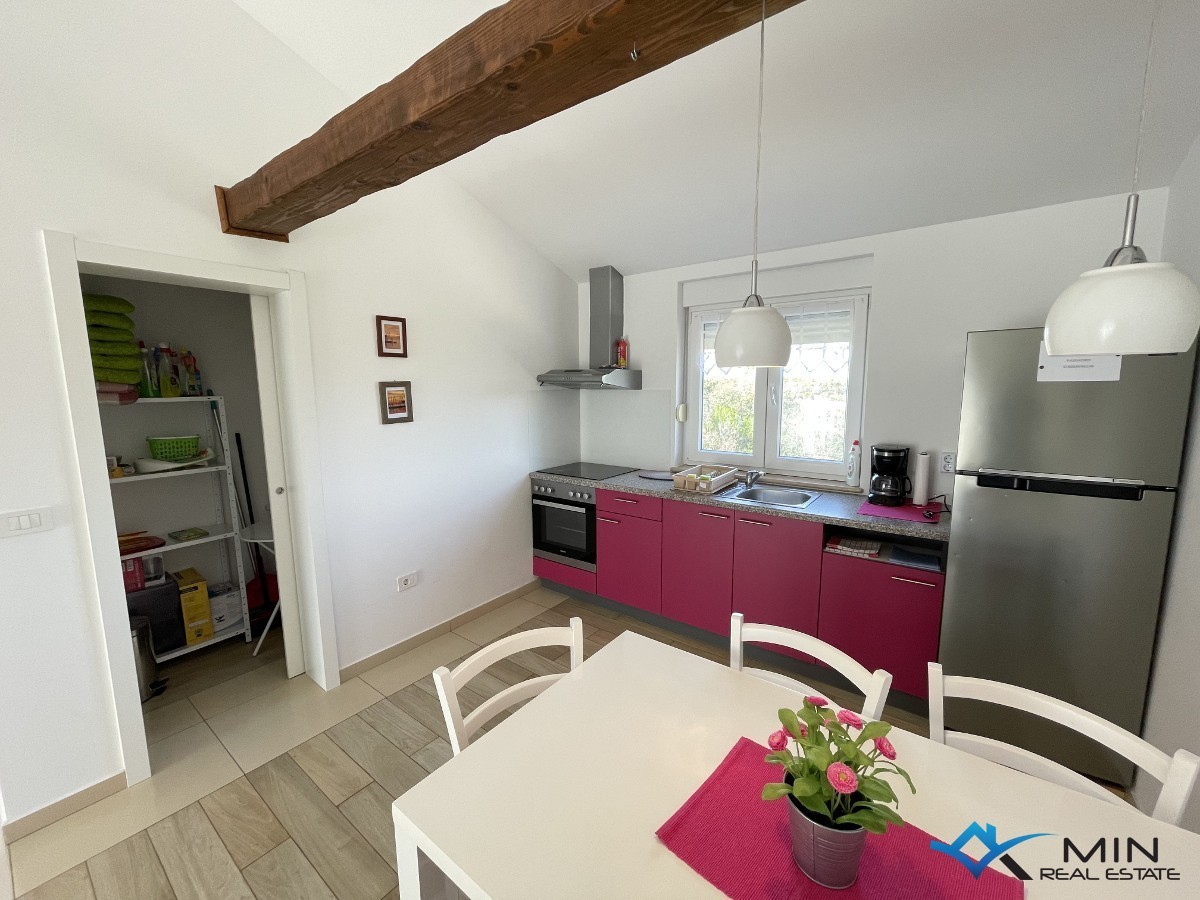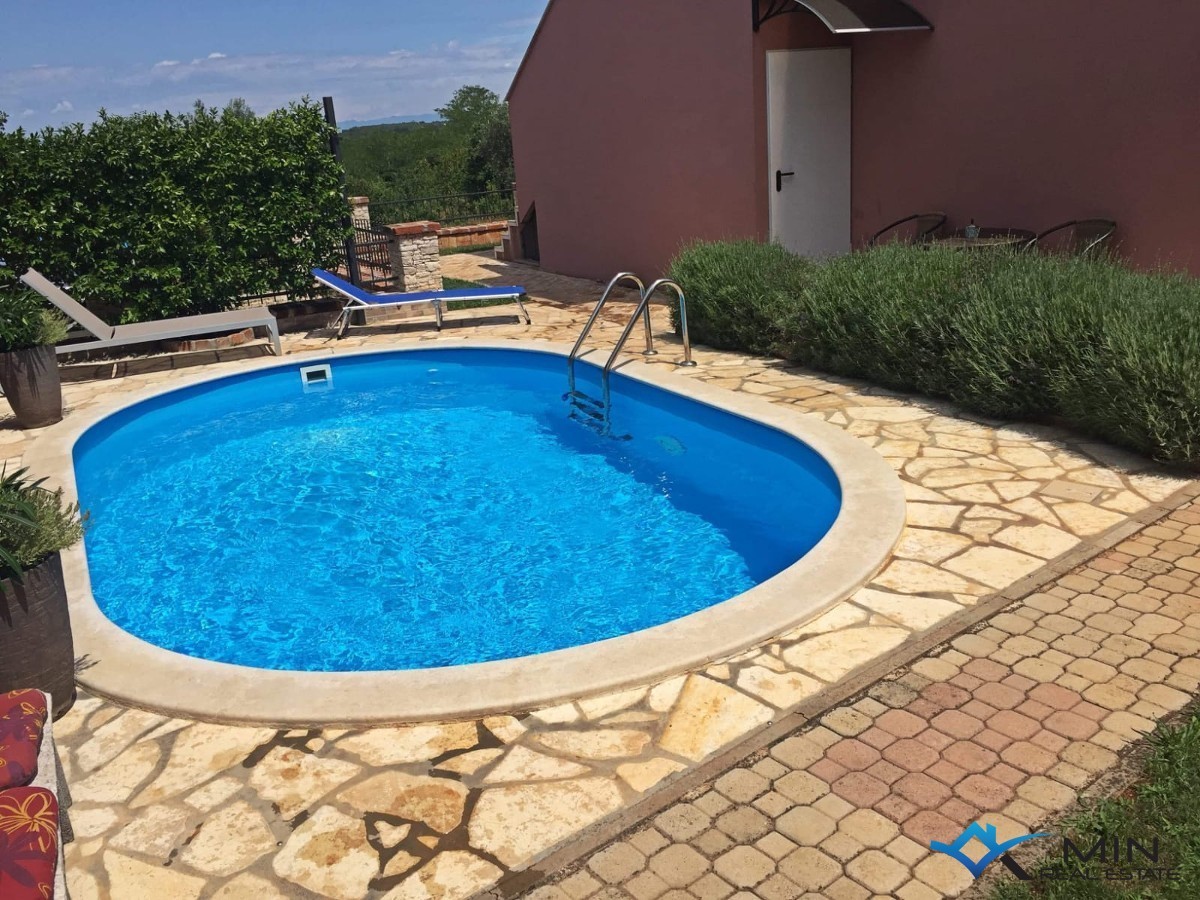 Charming house for sale in a quiet location near Umag. The house has a total of 152 m2 and is divided into 2 apartments. The ground floor apartment has 73 m2 and consists of an entrance hall, bathroom, 2 bedrooms, kitchen with dining area and living room with access to a covered terrace with fireplace and summer kitchen of 20 m2. The covered terrace can be glazed and thus get a winter garden. The apartment on the 2nd floor has 79 m2 and consists of an entrance hall, 2 bedrooms, kitchen with dining area and living room with exit to the terrace. The house has a shared pool and a beautifully landscaped garden of 398 m2. The house has a large covered parking for 4 cars + a garage of 38 m2 which is legalized and can accommodate 2 cars. The house can be used for residential or tourist purposes. Distance from the sea and beautiful beaches is 3 km, and the city center is 4 km away. The house is well made and does not require additional investment. The total area of the house with a garage and a covered terrace is 210 m2.