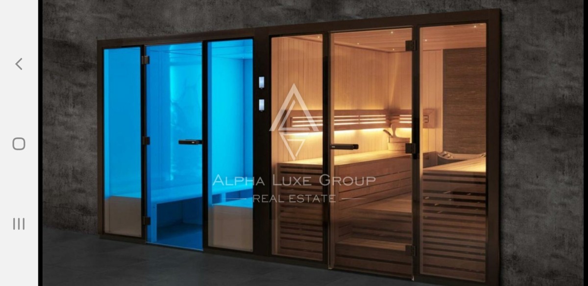 The 50 m² basement houses a wellness area complete with saunas and a utility space with a laundry room. The ground floor, spreading over 90 m², seamlessly connects to a 25 m² glass-enclosed porch, which serves as a comfortable extension of the indoor kitchen and dining area. Additionally, two bedrooms, two bathrooms, and a storage room complete this level.