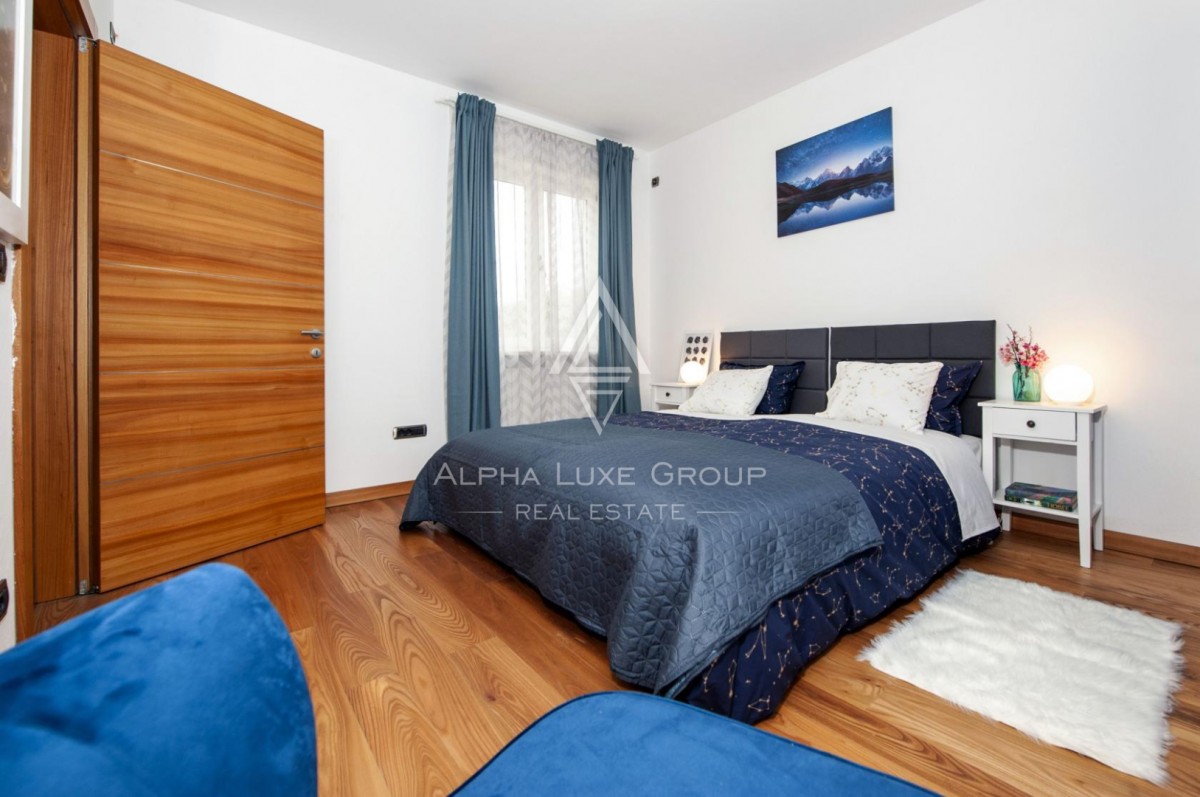 The upper floor offers a beautifully arranged residential unit with three luxury bedrooms, two modern bathrooms, a fully equipped kitchen and a generous living room. A large balcony overlooks the surrounding greenery, creating the perfect ambiance for relaxing summer evenings.