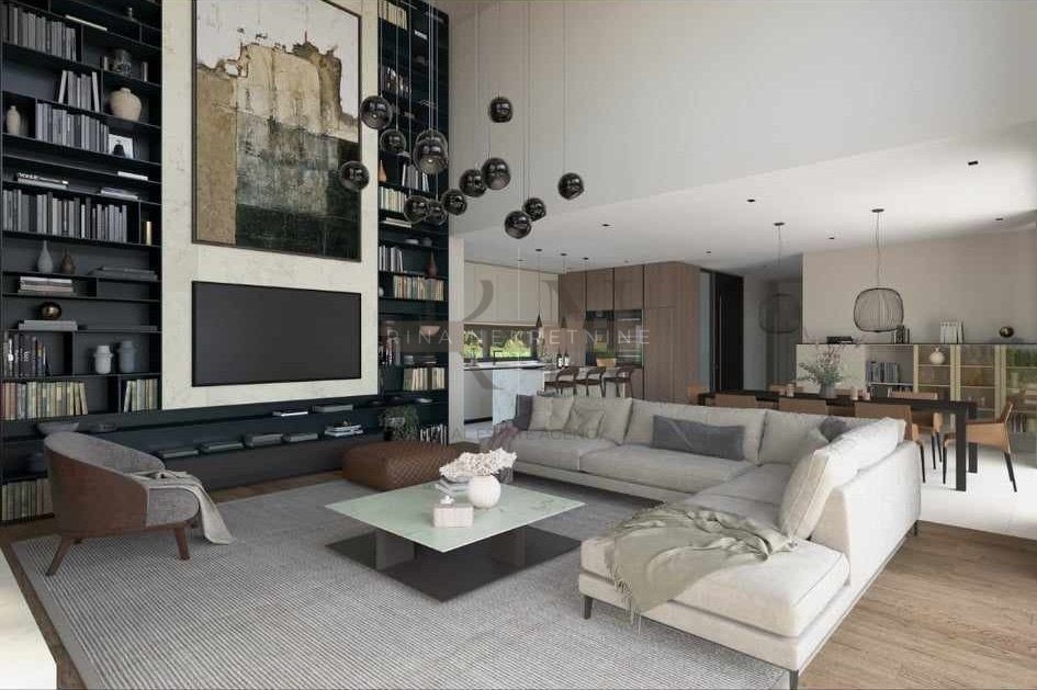 First: entrance area with guest toilet, technical room ideal for laundry, en suite bedroom with private bathroom of 24m2 in total and access to private terrace of 17.17m2, on the same floor there is an open space living room with kitchen that has 68.68m2 enriched with sliding ALU rocks so that the view from every part of the house would remain the same and stunning, and the exit to the terraces of a total of 41.25m2.