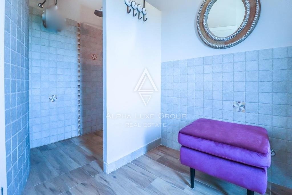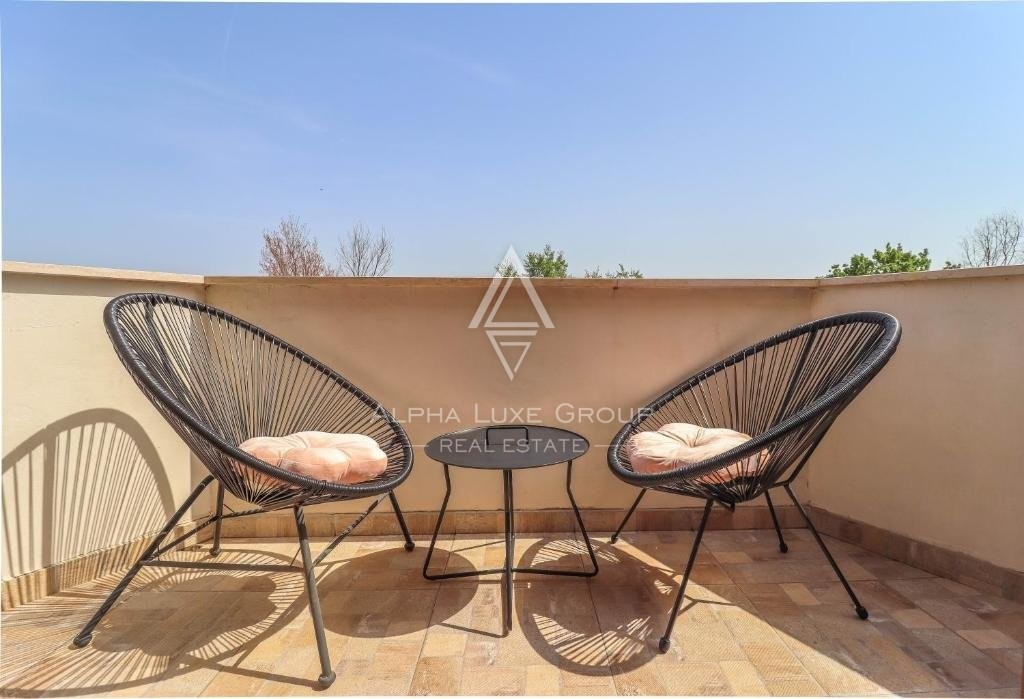 Ascending the elegant staircase, the first floor reveals a spacious corridor, bathroom, and three tastefully furnished bedrooms, one with an ensuite. Each room, fitted with quality furniture, satellite TV, and air conditioning, promises comfort and privacy. One bedroom offers balcony access, presenting panoramic views of the enchanting surroundings.