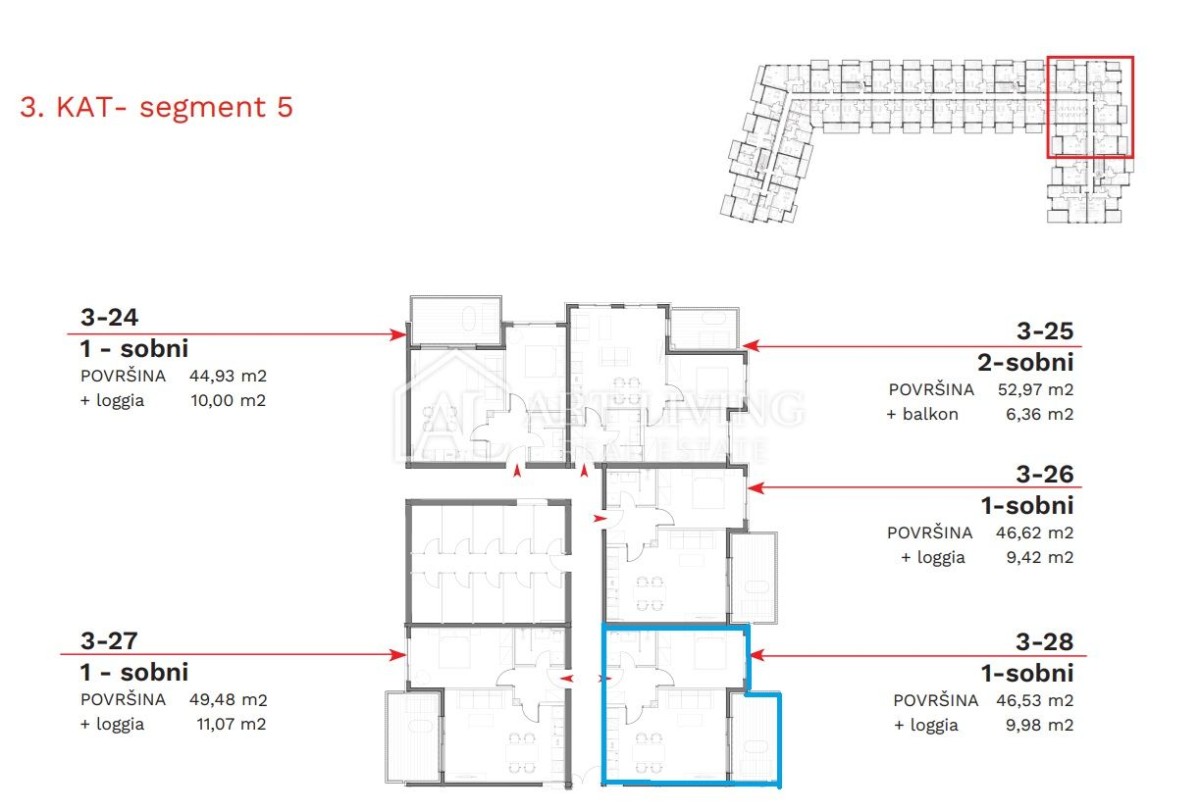 The apartment is located on the 3rd floor of a new modern building with an elevator. The total area of the apartment is 56.51 m2. It consists of a living room with kitchen and dining room, bathroom and bedroom. The living room opens onto a balcony of 10.00 m2. The apartment has a storage room and one garage parking space.