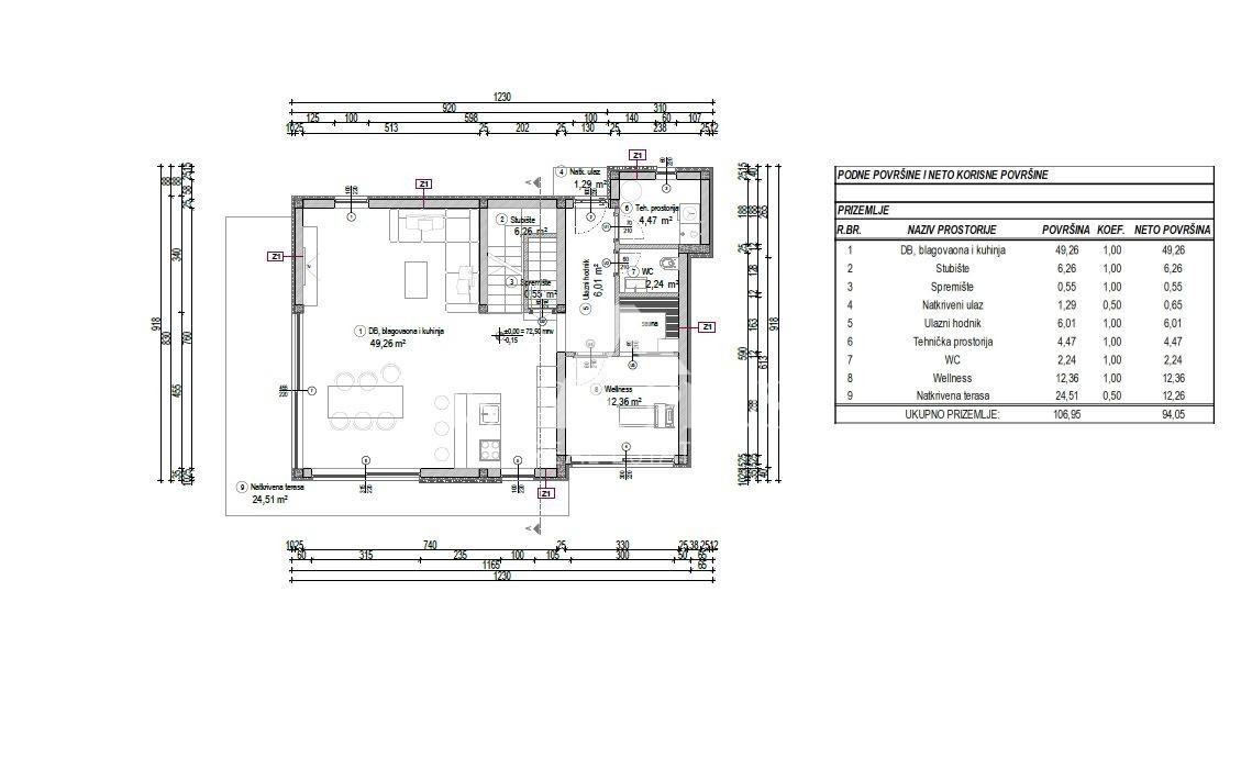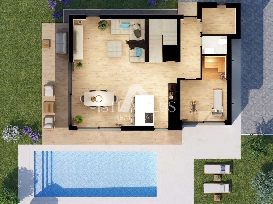 On the ground floor there is: a covered entrance, corridor, storage room, technical room, sauna and wellness, guest toilet, living room, kitchen and dining room according to the open space concept with access to a spacious covered terrace where there is a sunbathing area and a 27m² swimming pool.