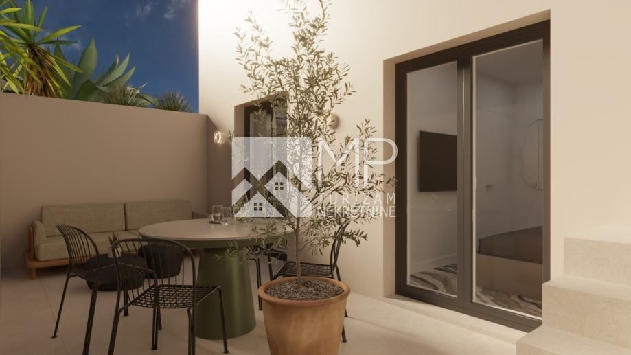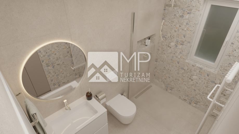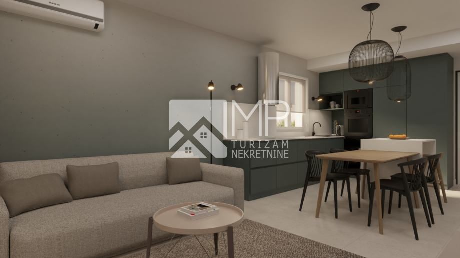 GROUND FLOOR APARTMENT (40.89 m2) includes: living room with kitchen, bedroom, bathroom, storage room, terrace and 140 m2 garden. The apartment also has one outdoor parking space.