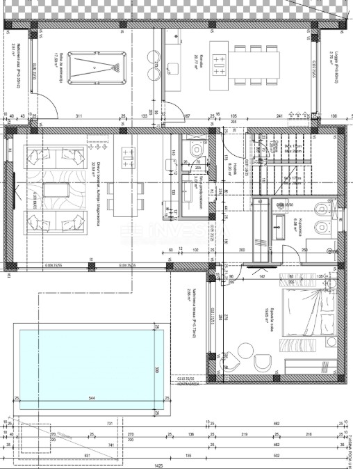 The outdoor pool (3 m x 5.44 m x 1.5 m) has an automatic saltwater system, and the garden features an automatic irrigation system. In addition to the garage, there is parking for two to three more cars.