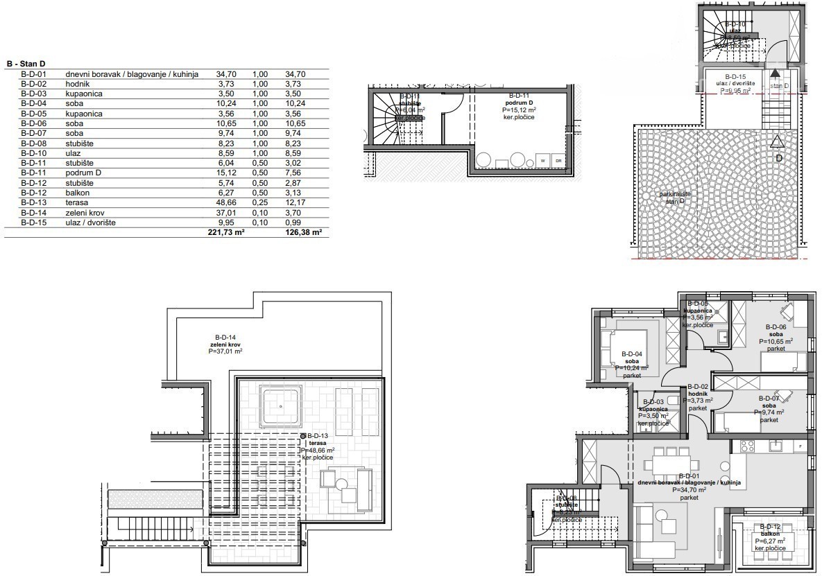 An internal staircase leads to the rooftop terrace with a floor area of 48.66 m², which has pre-installations for a jacuzzi and an outdoor kitchen, and offers a beautiful sea view.