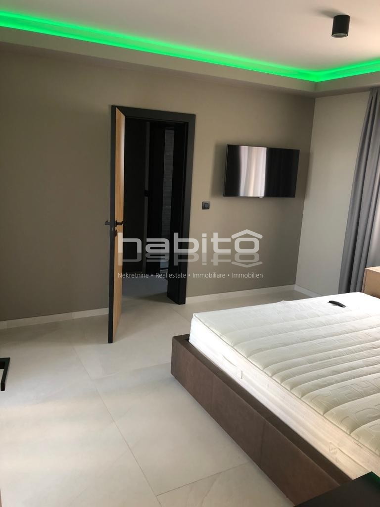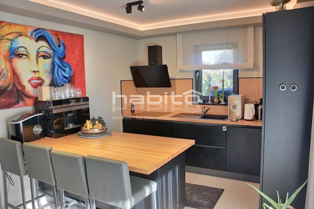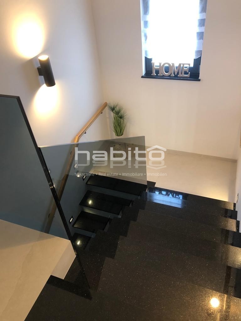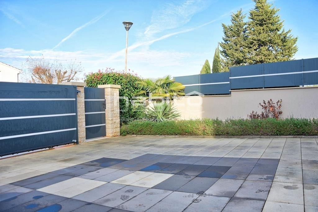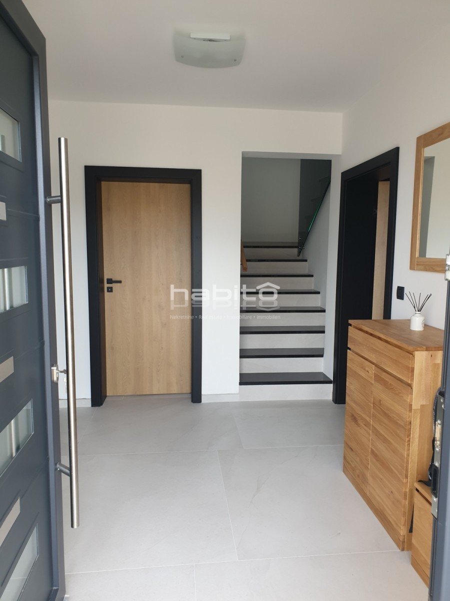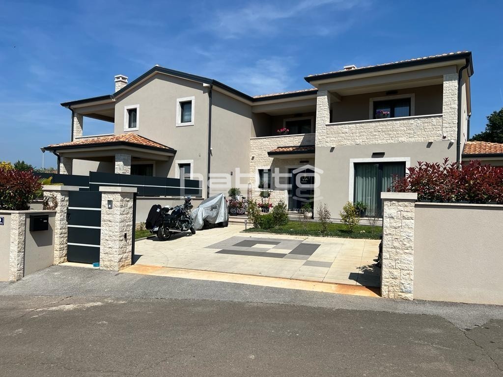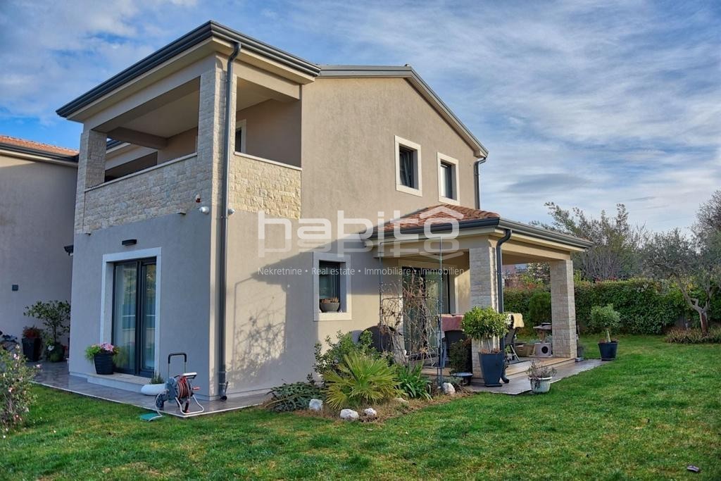 It is high quality construction with high quality finishing materials. The floors are covered with oak wood of 15 mm, windows sills made of marble "galaxy", stone Kanfanar of 5cm, LED lighting, 8 cm demit facade, automatic irrigation system, electrical opening of the gate and video-paraphone.