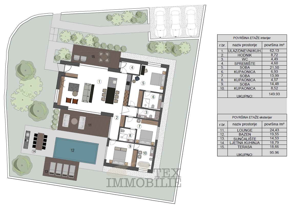 The land comes with a finished project and a building permit for a luxury single-storey house with 3 bedrooms and three bathrooms, total area 150 m².