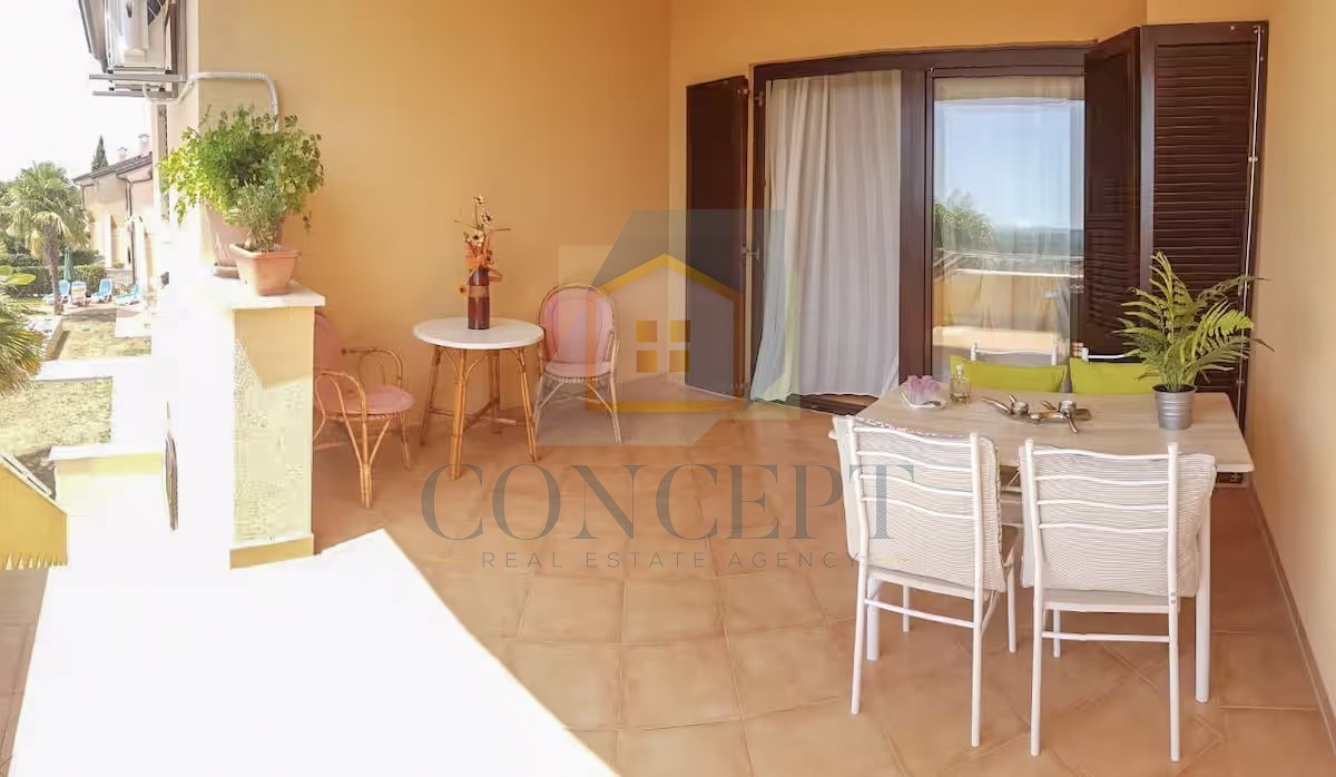 In a quiet location just 12 km from the sea and Poreč, a charming terraced house is for sale, part of an organized complex with a shared pool.