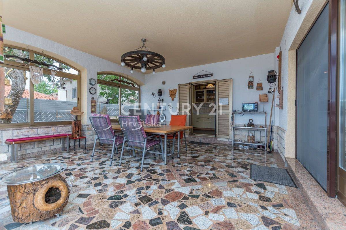 Entering the interior, the corridor leads to a spacious living room and dining room, a discreetly separated kitchen with access to an outdoor covered terrace, and an open space of another outdoor terrace in front of the entrance to the house.