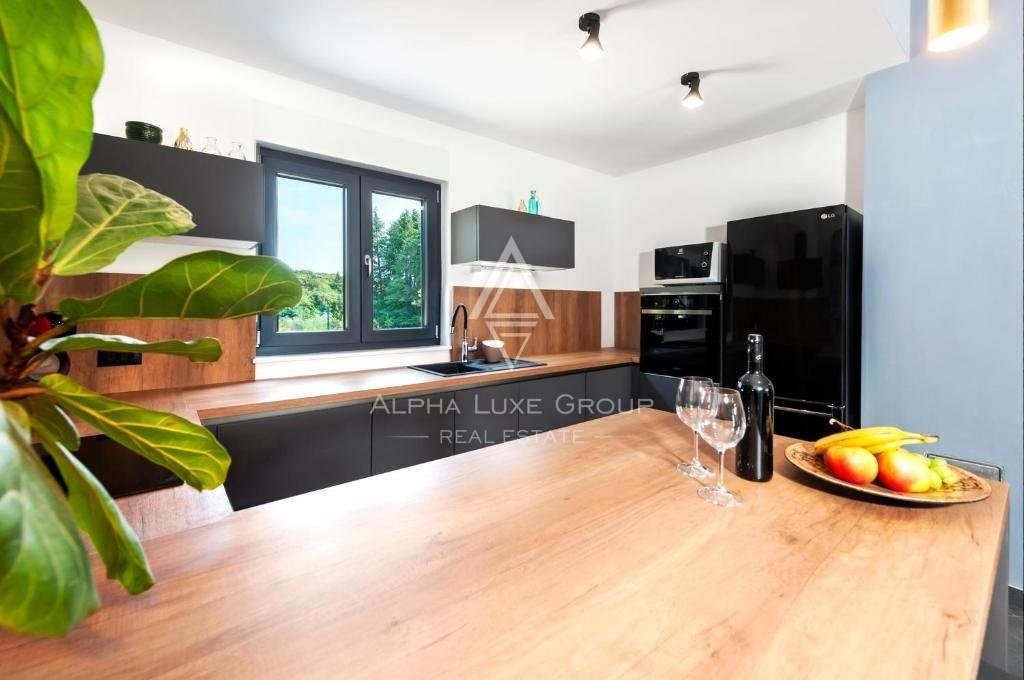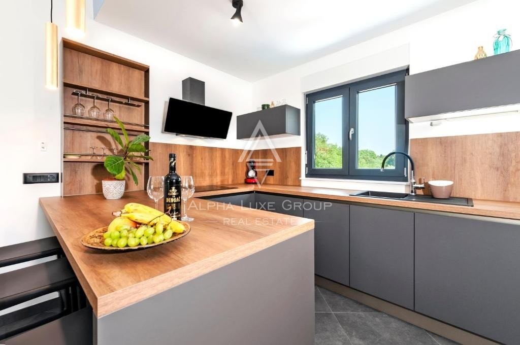Introducing a contemporary, newly-built home in Rovinj's serene surroundings, perfect for those seeking a blend of modern living and tranquil ambiance. This elegantly designed residence, nestled among lush greenery and family homes, offers a peaceful retreat just minutes away from Rovinj's vibrant center. With a total living space of 110.74m², the home is thoughtfully laid out with an open-plan living, kitchen, and dining area, fostering a warm environment for both entertaining and relaxation.