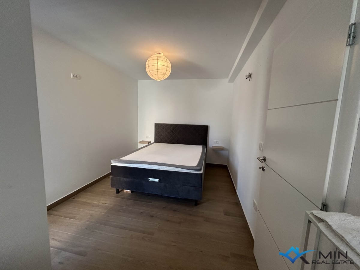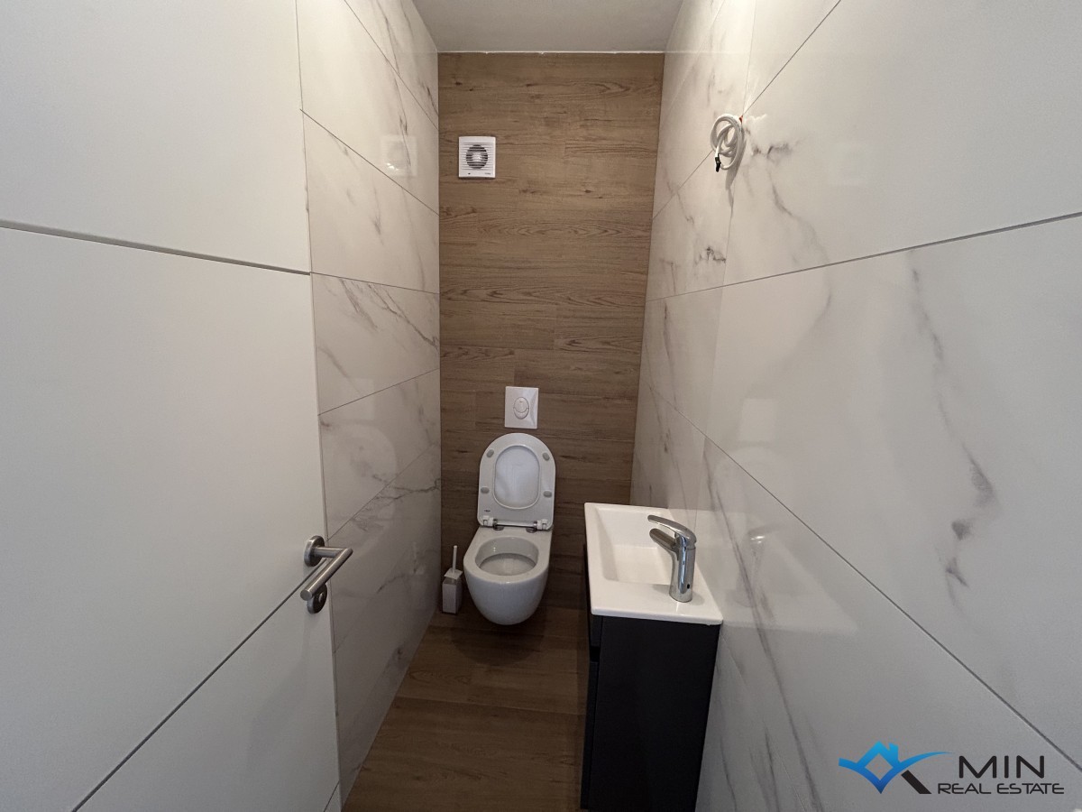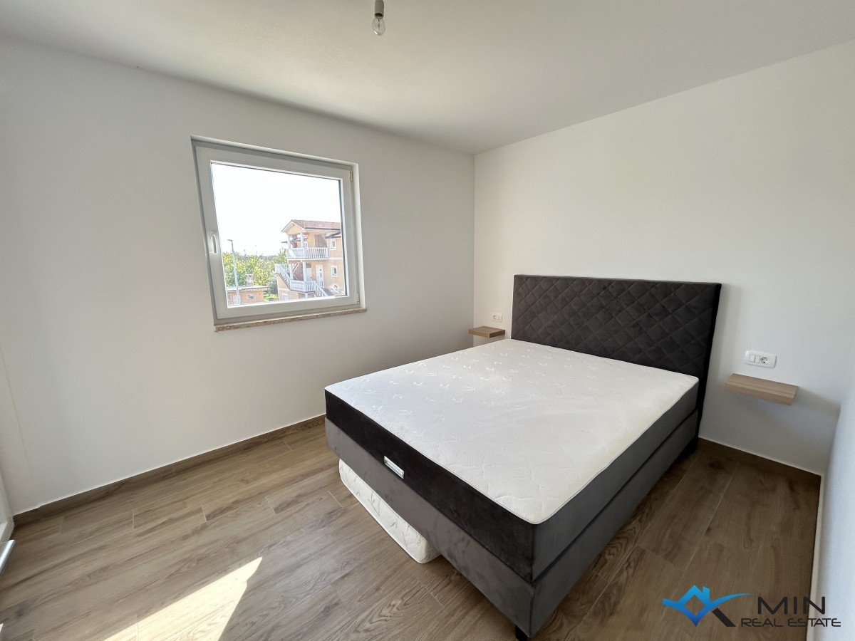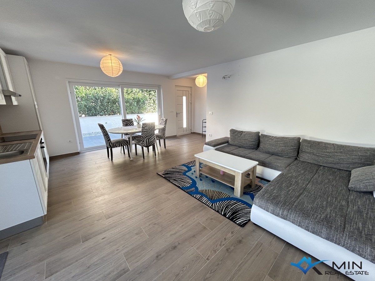 A modern semi-detached house is for sale in a peaceful location in Novigrad. The house is 115 m² and consists of a ground floor and first floor. On the ground floor, there is an entrance hallway, a guest toilet, a storage room, a bedroom with an en-suite bathroom, and an open-plan space that includes a kitchen with a dining area and a living room with access to a covered terrace, swimming pool, and sun deck. Upstairs, there are two bedrooms, each with its own private bathroom, and two covered terraces, one of which offers a sea view. The house also has an additional 20 m² room that can be used as a studio flat (all installations are in place), a garage, or extra storage, depending on the new owner's wishes. Heating and cooling are provided by air conditioning units. The property includes a garden of 267 m² where several cars can be parked. The house is being sold furnished.