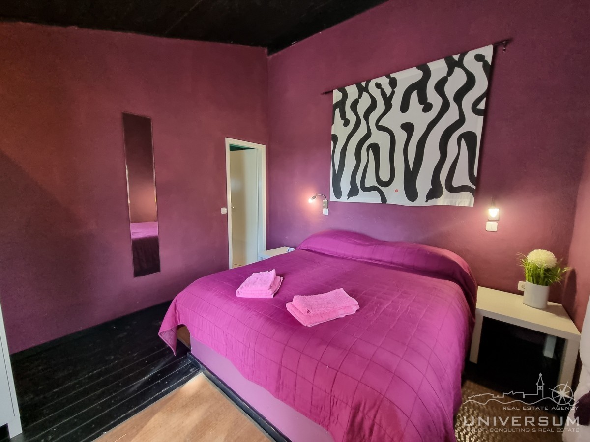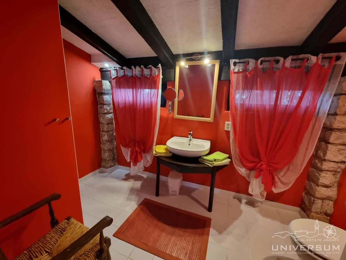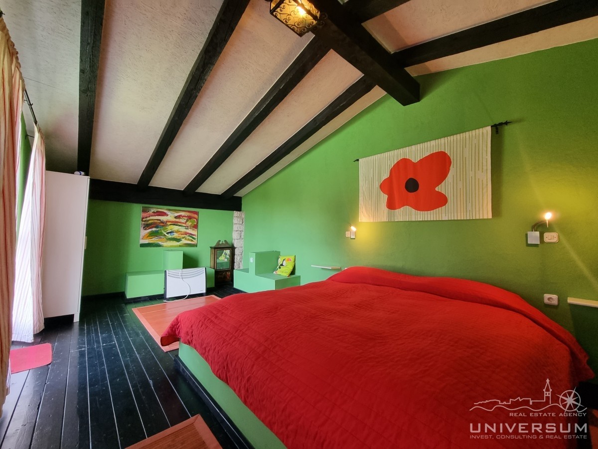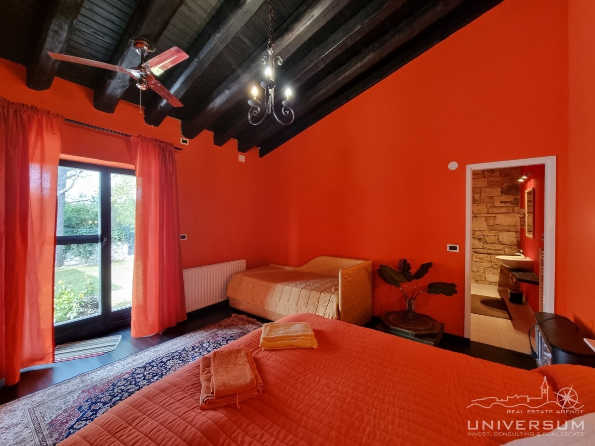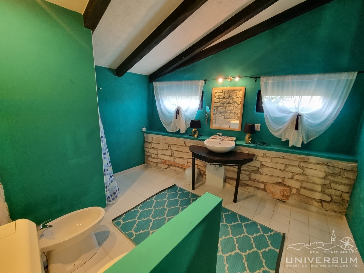 Beautiful historic stone villa with pool and sea view for sale in Umag. The villa is located only 150 m from the sea and the beach. The central villa has an area of 170 m2 and consists of a living room and dining room between which is a large fireplace, kitchen, bathroom, toilet and bedroom. Heating is central on oil. The villa was renovated in 2014 and is sold fully furnished. In addition to the villa, there are 3 auxiliary facilities. Two buildings of 30 m2 consist of one bedroom and a bathroom, while the third building of 50 m2 consists of one bedroom with a bathroom, while the other part, which has a separate entrance, has a bedroom and a bathroom that needs to be renovated.