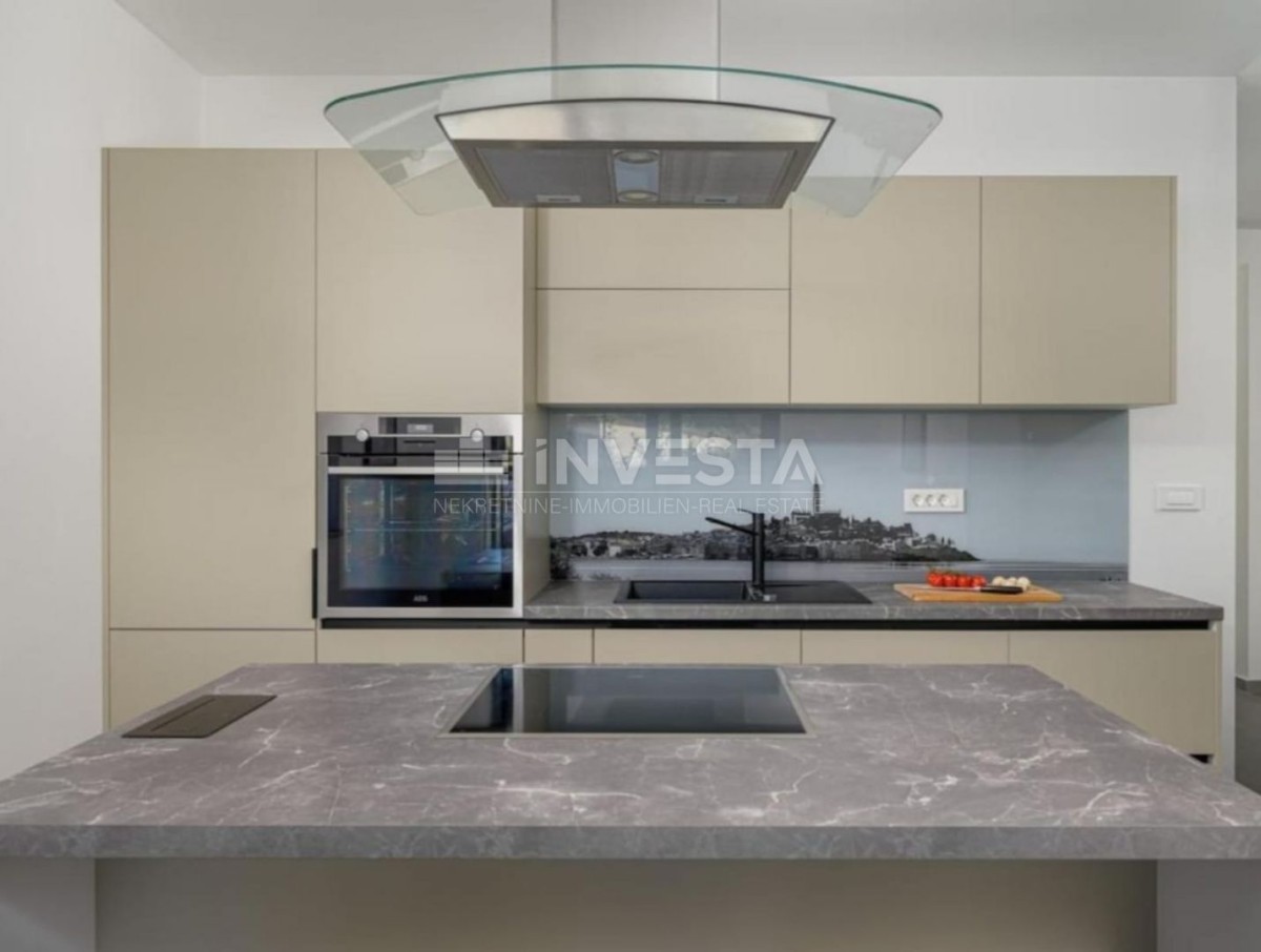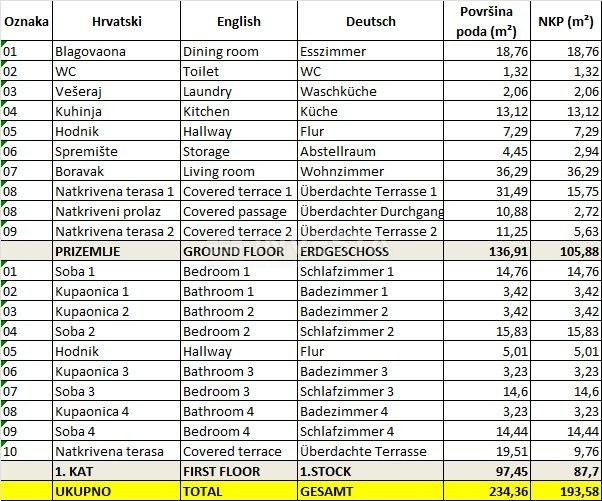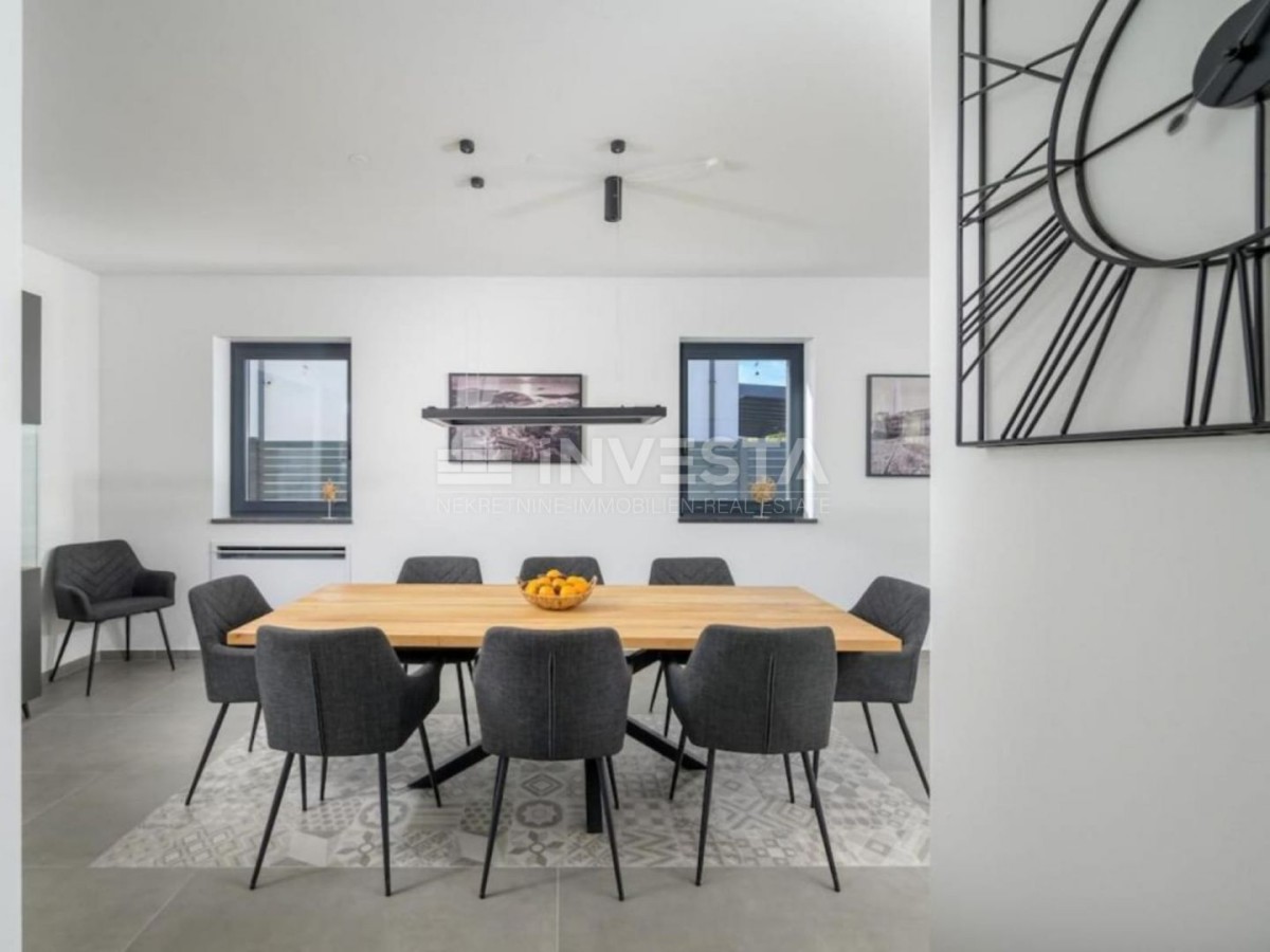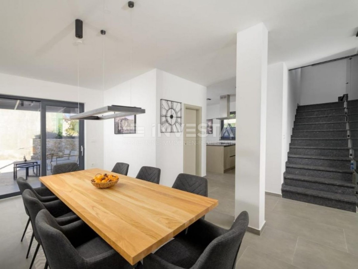 The villa has a modern design and high-quality materials were used in the construction. It is equipped with a modern heating and cooling system via a heat pump, underfloor heating in the bathrooms, and electric blinds.