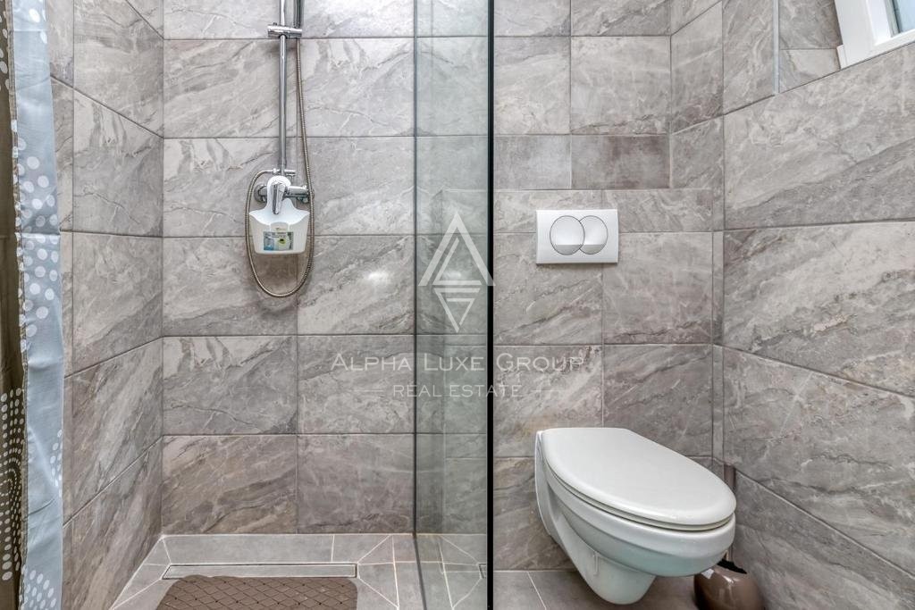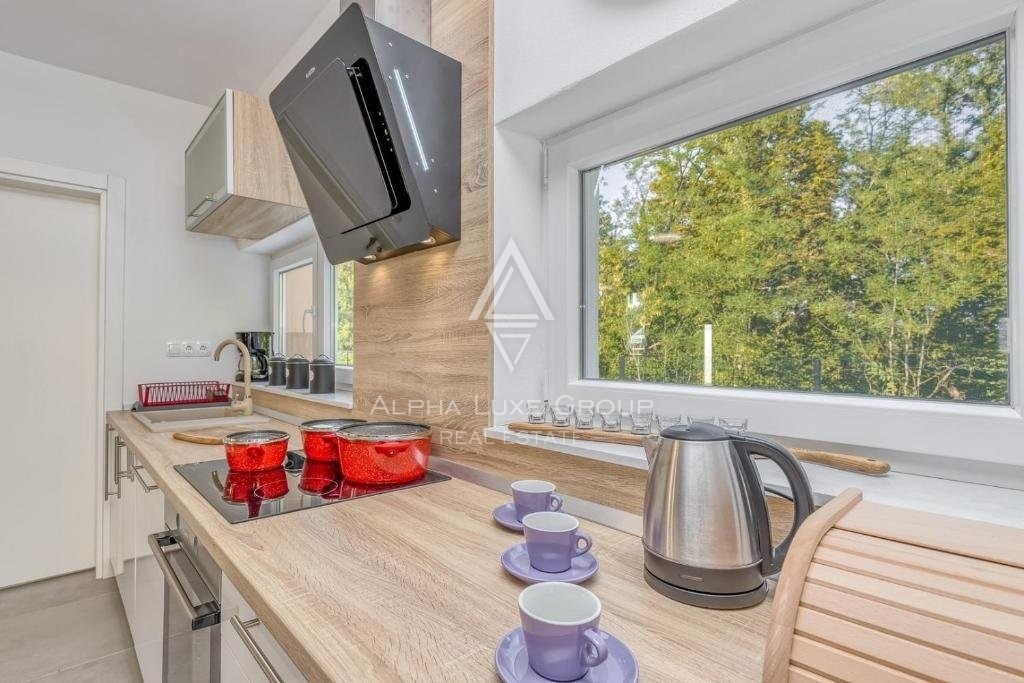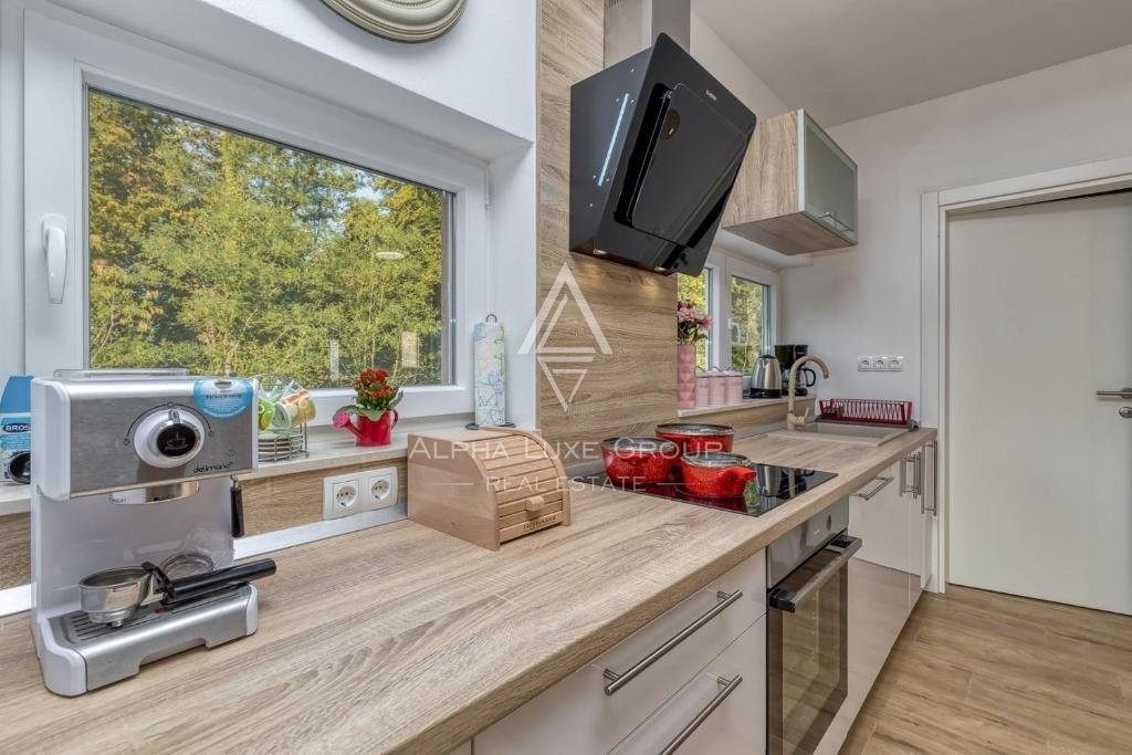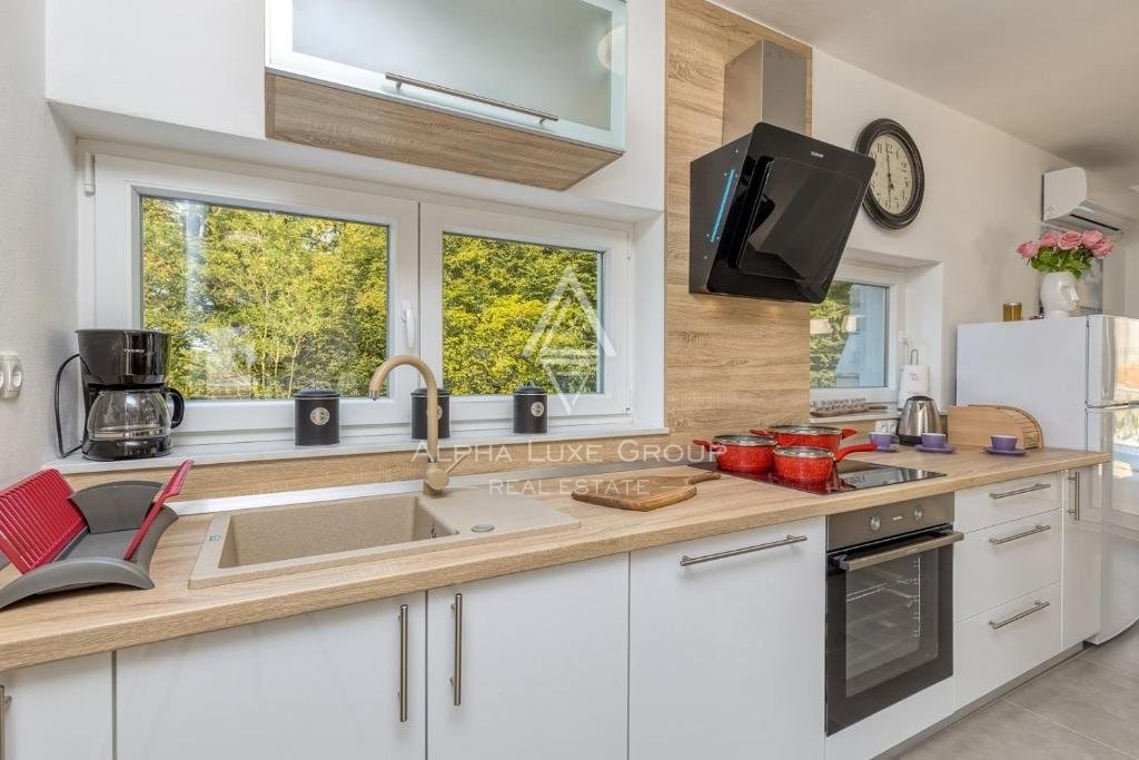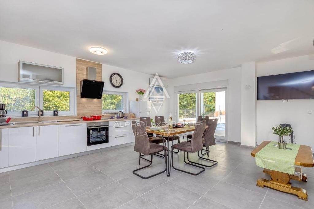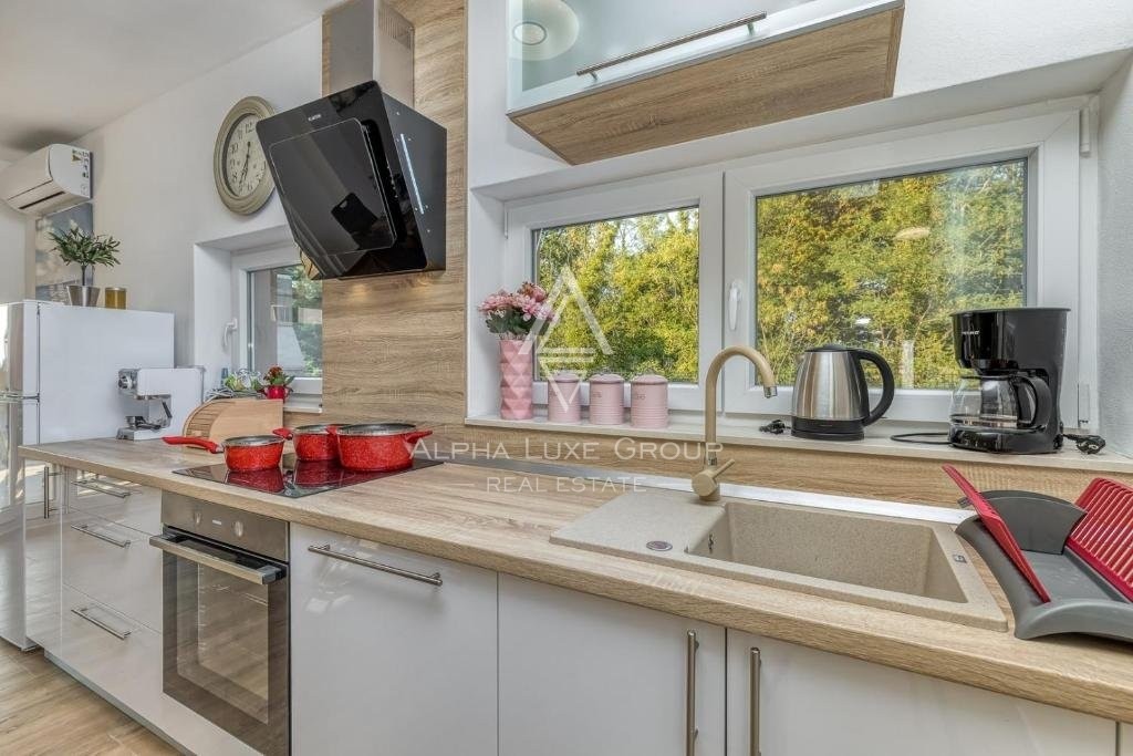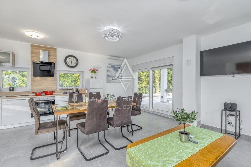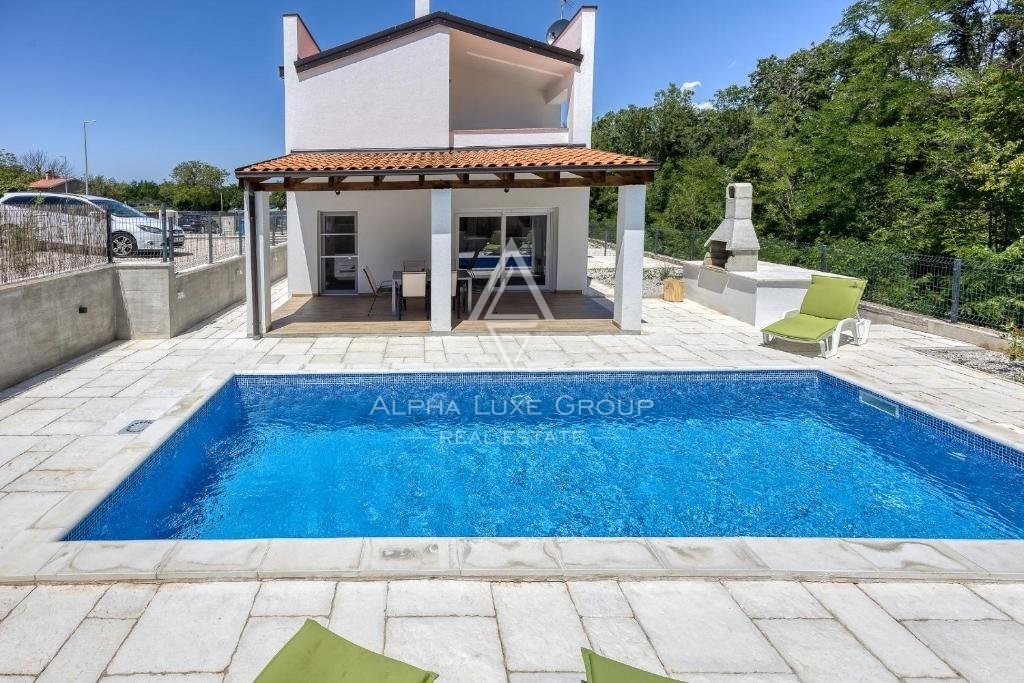 Offered for sale is a recently constructed semi-detached house in the serene area near Tinjan, completed in 2022. Spanning 84 m² across two levels, this home is accompanied by a 268 m² garden and includes two parking spots. The ground floor unveils a generous living area blending seamlessly with an open-plan kitchen and dining space, alongside a bathroom and storage room. Direct access from the living area leads to an inviting terrace and pool area. The first floor hosts two bedrooms, an additional bathroom, and a laundry room. Climate control is efficiently managed with air conditioning units, while the infrastructure for pellet central heating is already in place. Enhanced thermal insulation ensures minimal need for cooling during summer months.